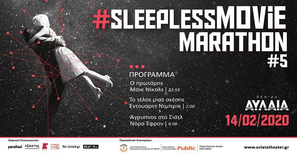 To 5ο Sleepless Movie Marathon και το πιο «γλυκό» έρχεται στις 14 Φεβρουαρίου και προβάλει 3 ταινίες με θέμα τον έρωτα. Οπότε πάρτε το ταίρι σας και περάστε μια διαφορετική μέρα του Αγίου Βαλεντίνου. Πρώτη προβολή το αριστούργημα του Μάικ Νίκολς, Ο Πρωτάρης (1967) με τις εκπληκτικές ερμηνείες των Ντάστιν Χόφμαν και της Αν Μπάνκροφτ. Στη συνέχεια την σκυτάλη παίρνει Το τέλος μιας Σχέσης (1955) του Εντουαρντ Ντμίτρικ ένα από τα μεγαλύτερα διαμάντια του παγκόσμιου κινηματογράφου. Η τελευταία προβολή του κινηματογραφικού μαραθωνίου πρόκειται για το ρομαντικό Άγρυπνος στο Σιάτλ (1993) της Νόρα Έφρον μια αισθηματική κομεντί που όποτε την δούμε μας προκαλεί ένα γλυκό σκίρτημα. Το εισιτήριο είναι 10€ ανά άτομο και περιλαμβάνει: τρεις ταινίες, ένα welcome drink, έναν καφέ και στο τέλος της τρίτης ταινίας, προσφέρεται πρωινό στο φουαγέ του θεάτρου.