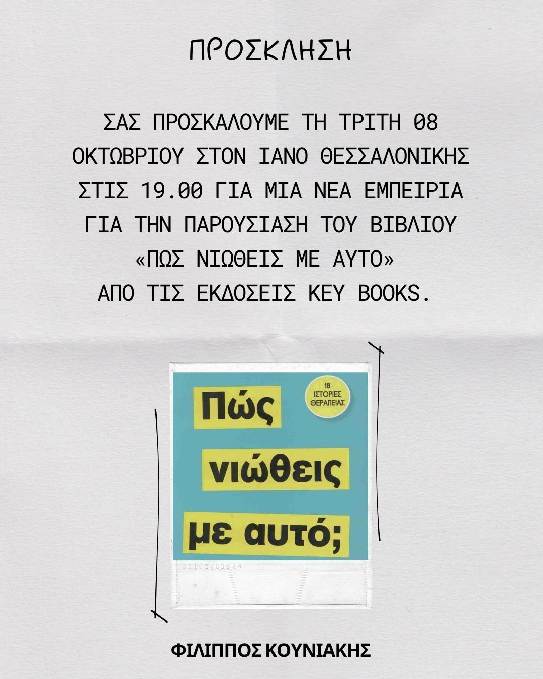 Την Τρίτη 8 Οκτωβρίου 2024, η Αλυσίδα Πολιτισμού IANOS και οι Εκδόσεις Key Books, διοργανώνουν παρουσίαση του βιβλίου του Φίλιππου Κουνιάκη με τίτλο «Πώς νιώθεις με αυτό;».