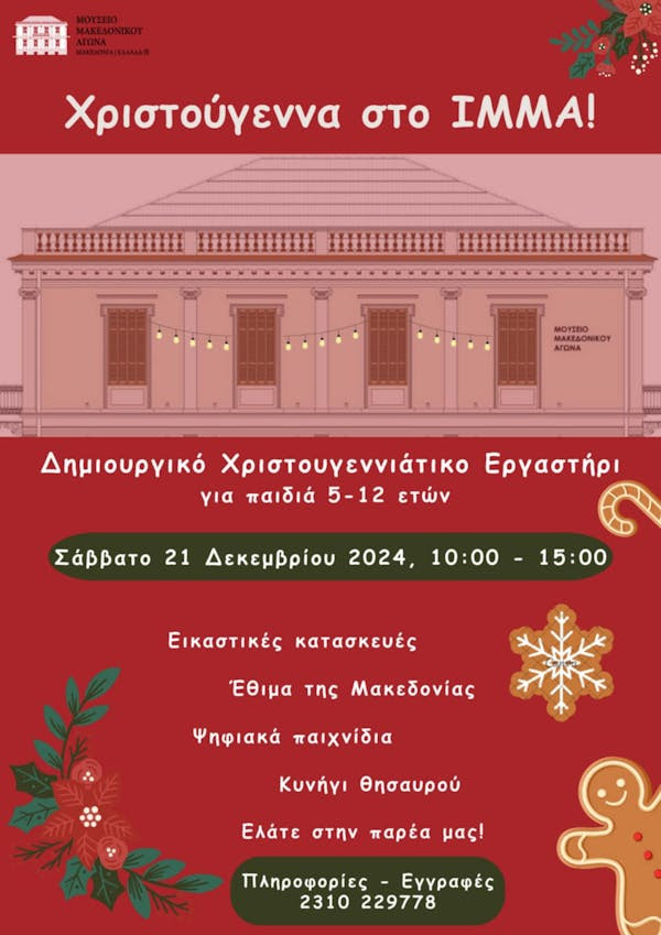 Το Ίδρυμα Μουσείου Μακεδονικού Αγώνα και της Νεότερης Ιστορίας της Μακεδονίας διοργανώνει το καθιερωμένο Χριστουγεννιάτικο Δημιουργικό Εργαστήρι για παιδιά ηλικίας 5 – 12 ετών, το Σάββατο, 21 Δεκεμβρίου 2024, από τις 10:00 π.μ. έως τις 15:00 μ.μ. στις αίθουσες του Μουσείου!