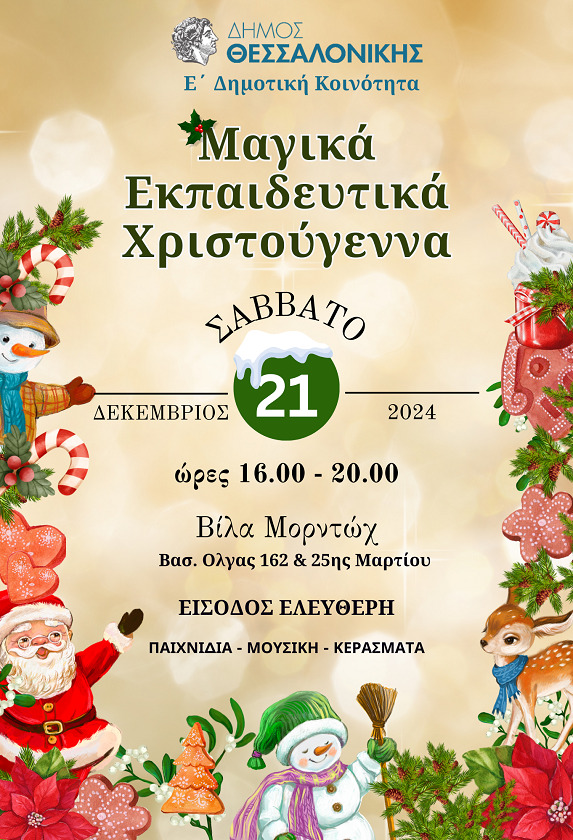 Ο Δήμος Θεσσαλονίκης και η Ε΄ Δημοτική Κοινότητα θα πραγματοποιήσουν Χριστουγεννιάτικη εκδήλωση για παιδιά στον χώρο της Βίλας Μορντώχ (Βασ. Όλγας 162 – 25ης Μαρτίου 24) με τίτλο «Μαγικά Εκπαιδευτικά Χριστούγεννα» το Σάββατο 21 Δεκεμβρίου 2024, από τις 16.00 έως τις 20.00.