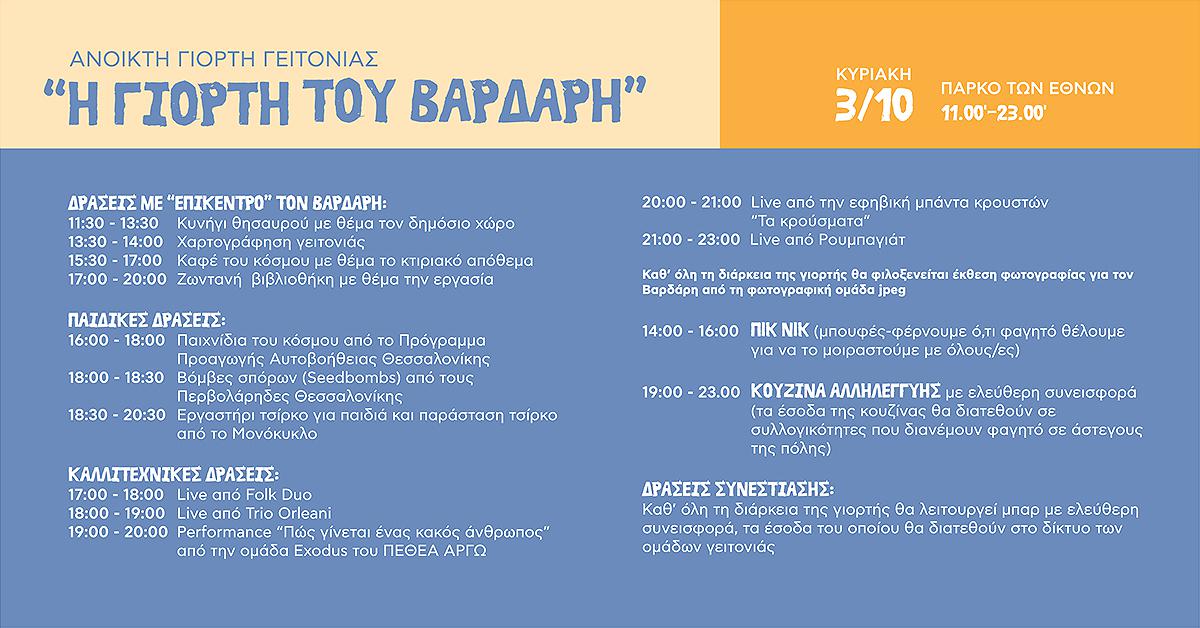 Η «Ομάδα Γειτονιάς του Βαρδάρη» του Προγράμματος Προαγωγής Αυτοβοήθειας του Α.Π.Θ. διοργανώνει την πρώτη ανοιχτή γιορτή γειτονιάς «Η Γιορτή του Βαρδάρη», που θα λάβει χώρα στις 3 Οκτωβρίου στο πάρκο των Εθνών.