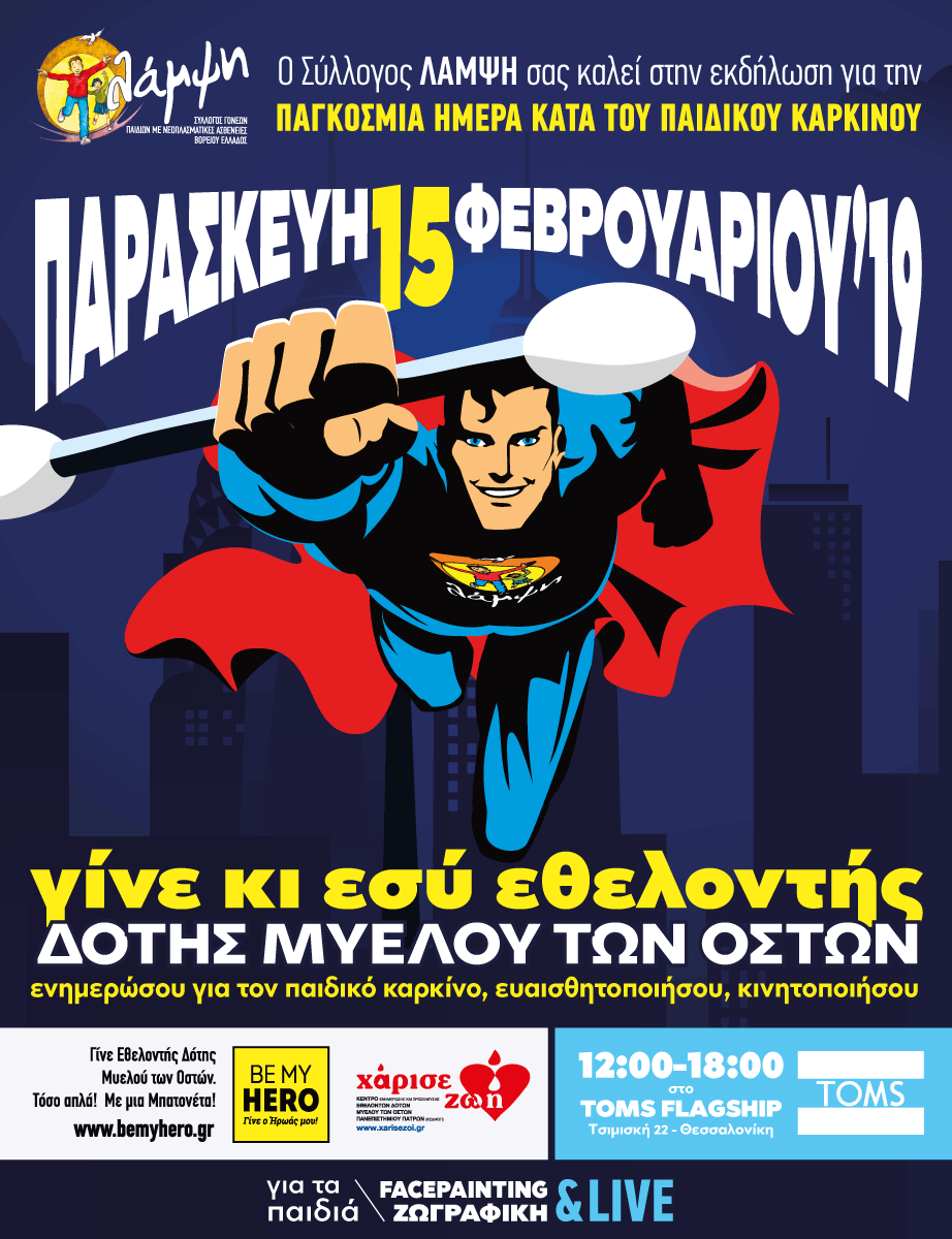 Με αφορμή την παγκόσμια ημέρα για τον παιδικό καρκίνο, την Παρασκευή 15 Φεβρουαρίου ο Σύλλογος Γονέων Παιδιών με Νεοπλασματικές Ασθένειες Βόρειας Ελλάδας «Η ΛΑΜΨΗ» σε συνεργασία με την Αστική μη Κερδοσκοπική Εταιρία «Be my Hero-Γίνε ο Ήρωάς μου!» σας προσκαλούν για άλλη μια χρονιά σε μια εκδήλωση ενημέρωσης, ευαισθητοποίησης για τον παιδικό καρκίνο και εγγραφής νέων εθελοντών δοτών μυελού των οστών. Πέρυσι εγγράφηκαν 385 Εθελοντές Δότες Μυελού των Οστών, φέτος ας ξεπεράσουμε κάθε προσδοκία! Ελάτε στη δράση και με τη μέθοδο της μπατονέτας, μπείτε και εσείς στη λίστα υποψηφίων δοτών, δίνοντας ελπίδα στα άτομα που νοσούν και περιμένουν τον συμβατό δότη που θα τους οδηγήσει στην ίαση.
