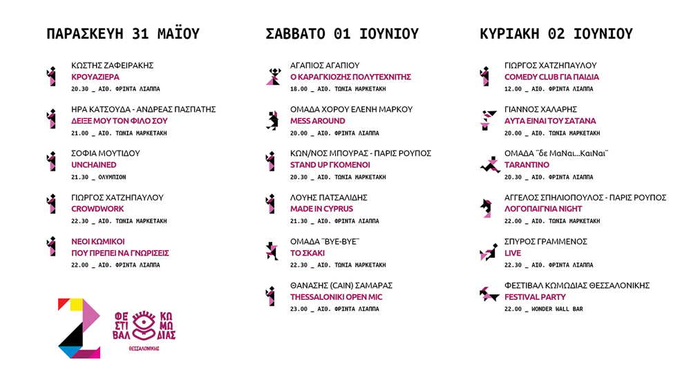 Περισσότεροι από 30 καλλιτέχνες από όλη την Ελλάδα, συμμετέχουν σε ένα τριήμερο κωμωδίας με ευφάνταστο χιούμορ και πολύ γέλιο. Στόχος, της φετινής διοργάνωσης, είναι να αποτελέσει για μια ακόμη φορά σημείο συνάντησης καλλιτεχνών και μια μοναδική εμπειρία για το κοινό της Θεσσαλονίκης, που θα έχει την ευκαιρία να απολαύσει εξαιρετικές παραστάσεις από το ευρύτερο φάσμα της κωμωδίας, αναλυτικά το πρόγραμμα περιλαμβάνει: stand up comedy, θέατρο, music comedy, λογοπαίγνια, μαγικά, χορό, animation και θέατρο σκιών.