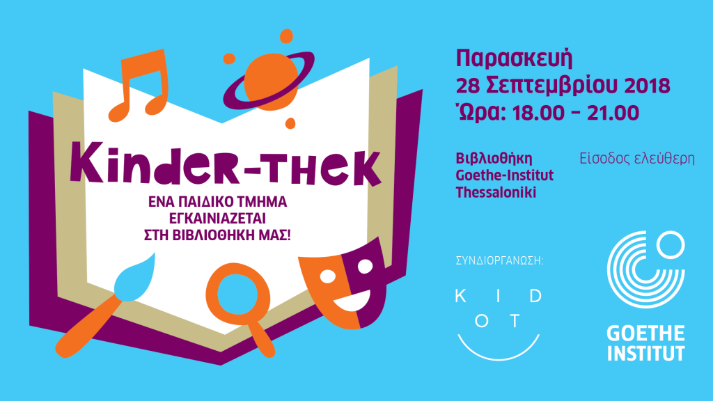 Το Goethe-Institut Thessaloniki θέλοντας να ταξιδέψει μικρούς και μεγάλους στον κόσμο της παιδικής του βιβλιοθήκης, σε συνεργασία με την ομάδα KIDOT, διοργανώτρια του μεγαλύτερου παιδικού φεστιβάλ στη Βόρεια Ελλάδα, σας προσκαλεί στην εκδήλωση εγκαινίων Κinder-thek.