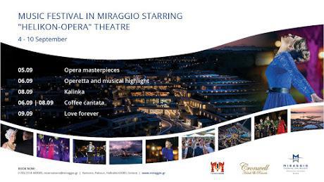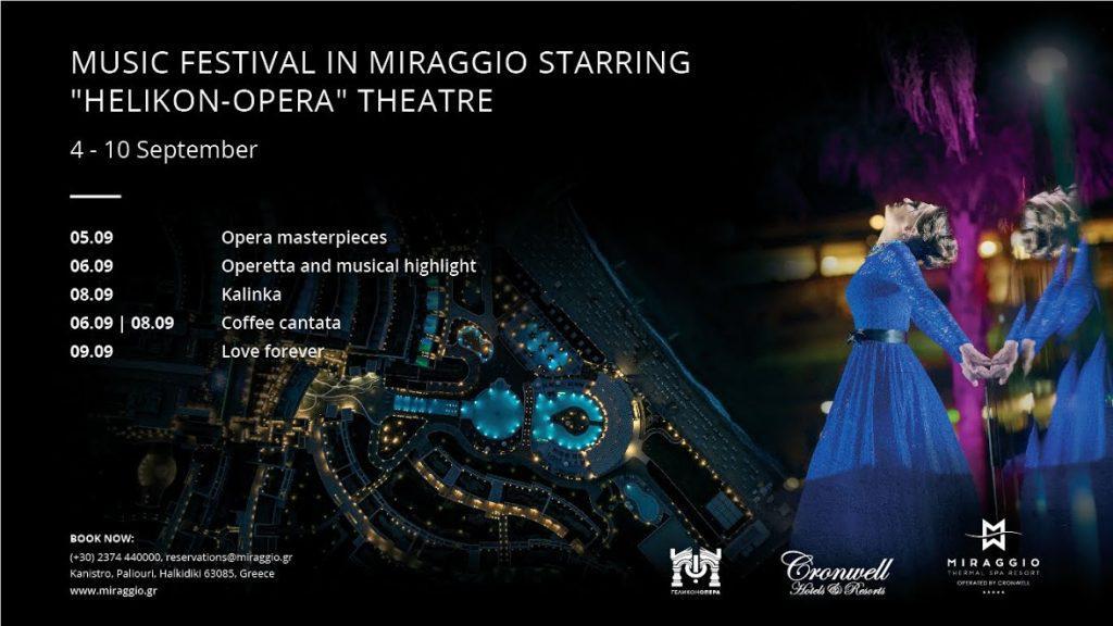 Το μουσικό φεστιβάλ του Miraggio με τη συμμετοχή κορυφαίων σολίστ του παγκοσμίου φήμης θεάτρου “Helicon Opera”, θα πραγματοποιηθεί από τις 4 έως 10 Σεπτεμβρίου. Ως άξιος κληρονόμος της μεγάλης παράδοσης της ρωσικής όπερας, το θέατρο “Helicon Opera” είναι πάντα ανοικτό σε νέες ανακαλύψεις και πειραματισμούς.