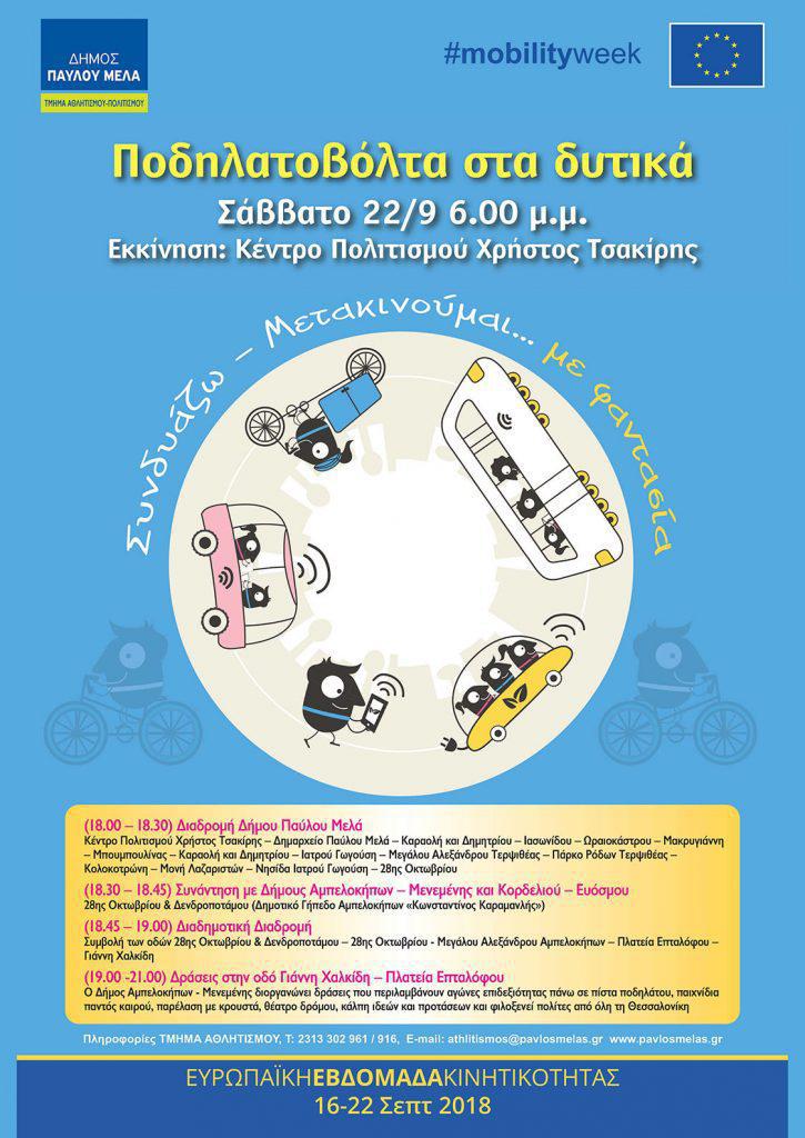 Ο Δήμος Παύλου Μελά στο πλαίσιο της Ευρωπαϊκής Εβδομάδας Κινητικότητας 2018 διοργανώνει «Ποδηλατοβόλτα στα δυτικά» με εκκίνηση μπροστά στο Κέντρο Πολιτισμού Χρήστος Τσακίρης το Σάββατο 22 Σεπτεμβρίου 2018 και ώρα 18.00.