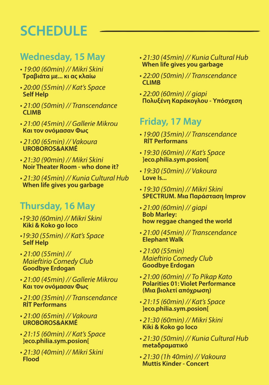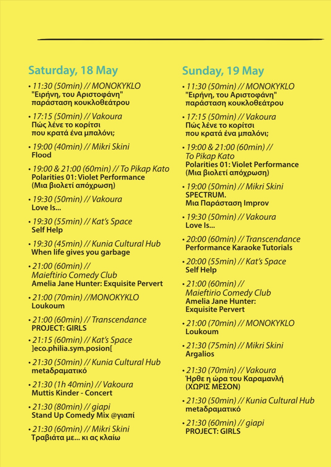 Το φεστιβάλ στηρίζει την ελληνική καλλιτεχνική σκηνή και δίνει χώρο σε ανερχόμενους καλλιτέχνες, εντάσσοντας στο πρόγραμμά του παραστάσεις όπως τις When life gives you garbage, Kαι τον ονόμασαν Φως, PROJECT: GIRLS και SPECTRUM. Μια Παράσταση Ιmprov.