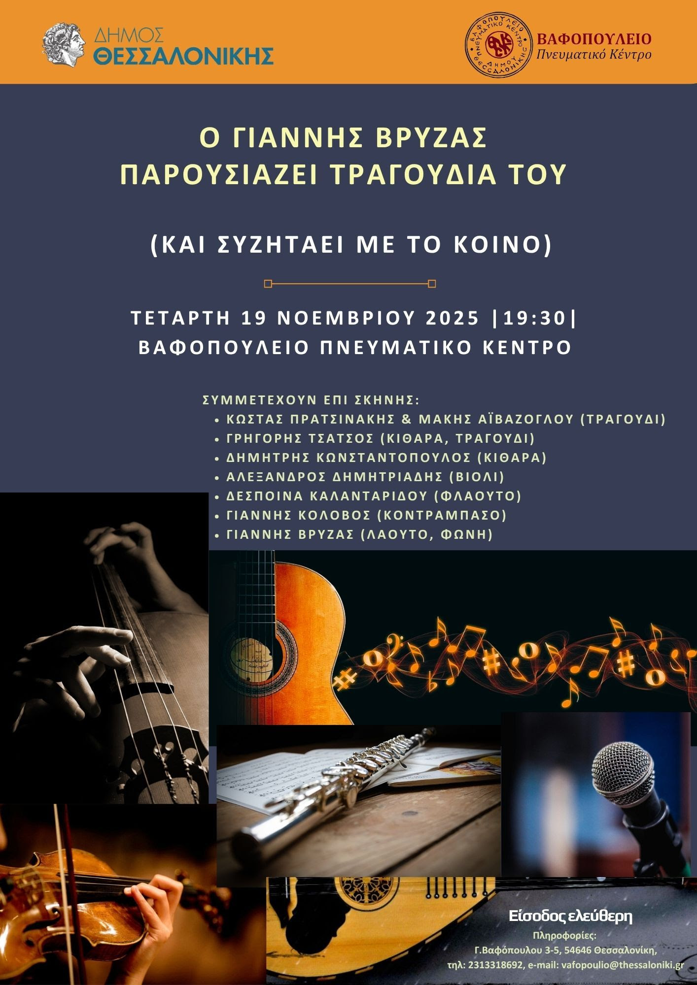 Μουσική εκδήλωση με τίτλο «Ο Γιάννης Βρύζας παρουσιάζει τραγούδια του (και συζητάει με το κοινό)» διοργανώνει το Βαφοπούλειο Πνευματικό Κέντρο του Δήμου Θεσσαλονίκης, την Τετάρτη 19 Νοεμβρίου 2025, στις 19:30, στο θέατρο (1ος όροφος, Γ. Βαφόπουλου 3). Στην εκδήλωση θα παρουσιαστεί μια επιλογή τραγουδιών και συνθέσεων του Γιάννη Βρύζα, που ηχογραφήθηκαν από κορυφαίους συντελεστές, όπως οι: Αγάθων, Κώστας Πρατσινάκης, Γιώργος Μπαγιώκης, Χρήστος Χαλκιάς, Μιχ. Λ. Κωνσταντινίδης, Μέλα Γεροφώτη κ.ά., αλλά και μουσικούς όπως οι: Κώστας Χανής, Κυρ. Γκουβέντας, Θανάσης Μπιλιλής, Μάνος Αχαλινωτόπουλος, Ross Daly, Δημ. Μυστακίδης, Αβραάμ Παπαϊωάννου, Μανώλης Ανδρουλιδάκης, Eduardo García, Θάνος Σταυρίδης, κ.ά.
