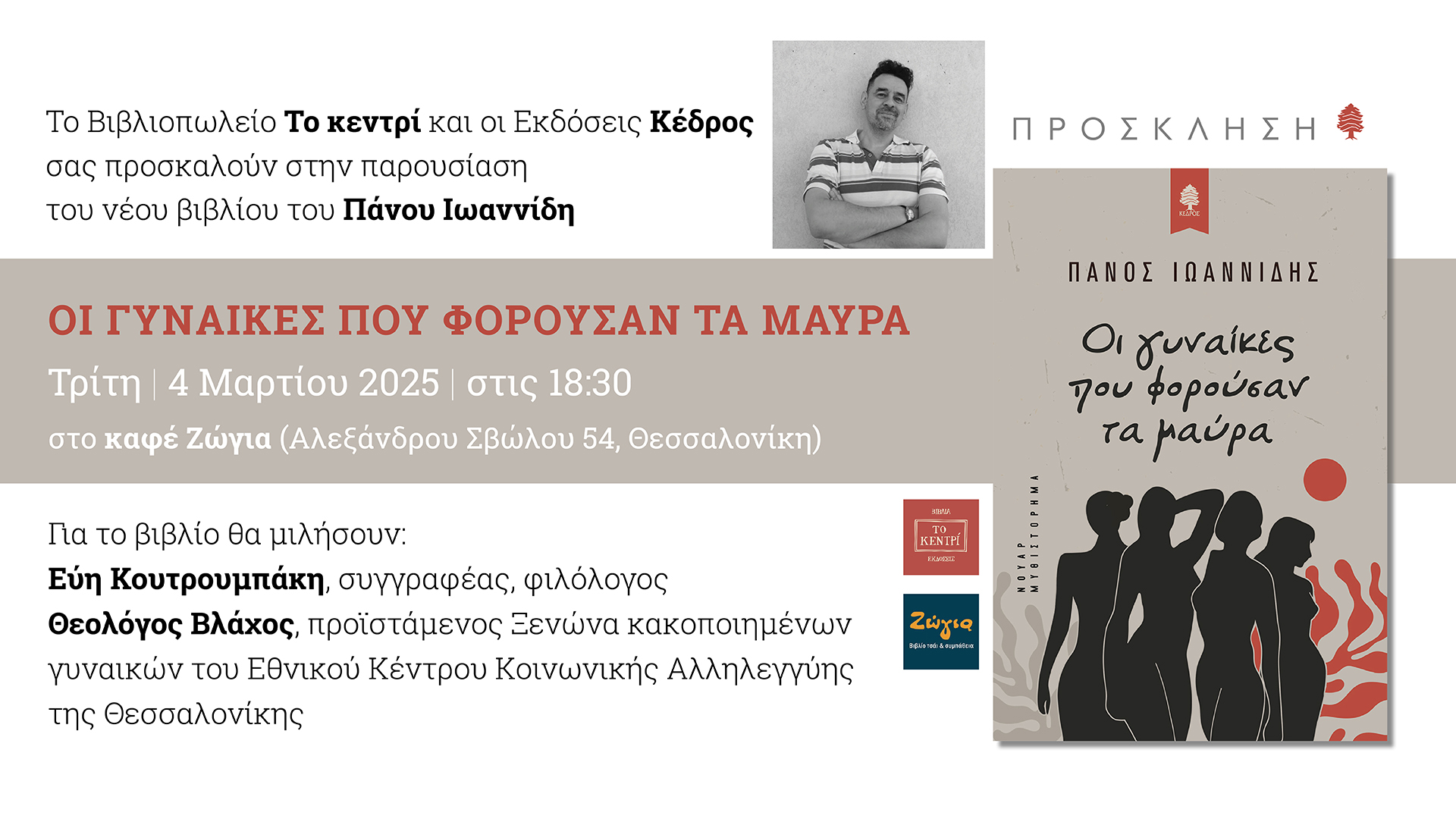Για το βιβλίο θα μιλήσουν: Εύη Κουτρουμπάκη, συγγραφέας, φιλόλογος, Θεολόγος Βλάχος, προϊστάμενος Ξενώνα κακοποιημένων γυναικών του Εθνικού Κέντρου Κοινωνικής Αλληλεγγύης της Θεσσαλονίκης