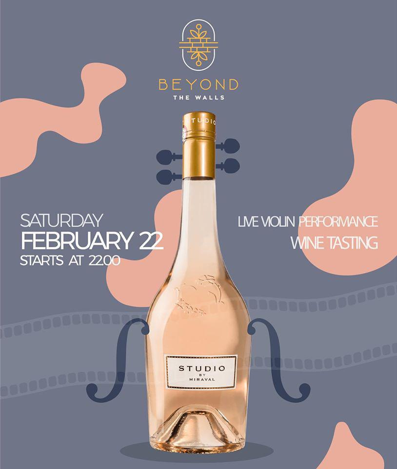 Βράδυ Σαββάτου, το Château Miraval από την νότια Γαλλία των Brad Pitt και Angelina Jolie, παρουσιάζει το fancy ροζέ κρασί του, «Studio MIRAVAL», στο Beyond the Walls παρέα με live βιολί και soundtracks παλιών ταινιών του ευρωπαϊκού και όχι μόνο κινηματογράφου.