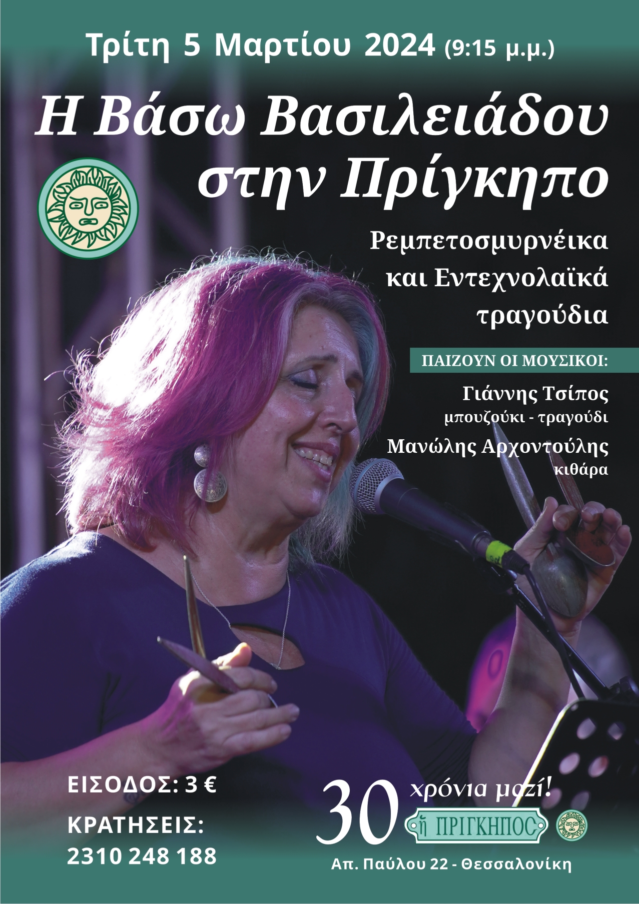 Τρίτη 5 Μαρτίου 2024 στις 21:15, η Βάσω Βασιλειάδου στην Πρίγκηπο, Εἰσοδος 3 ευρώ.
