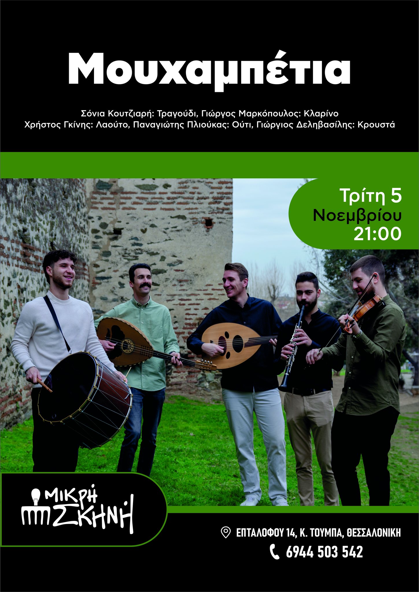 Η Μικρή Σκηνή, ανοίγει τις πόρτες της σε νέους καλλιτέχνες της παραδοσιακής και λαϊκής μουσικής, σπουδαστές ή απόφοιτους του τμήματος Μουσικής Επιστήμης & Τέχνης του Πανεπιστημίου Μακεδονίας. Το πρώτο σχήμα που θα φιλοξενηθεί, είναι τα “Μουχαμπέτια”, την Τρίτη 5 Νοεμβρίου 2024.