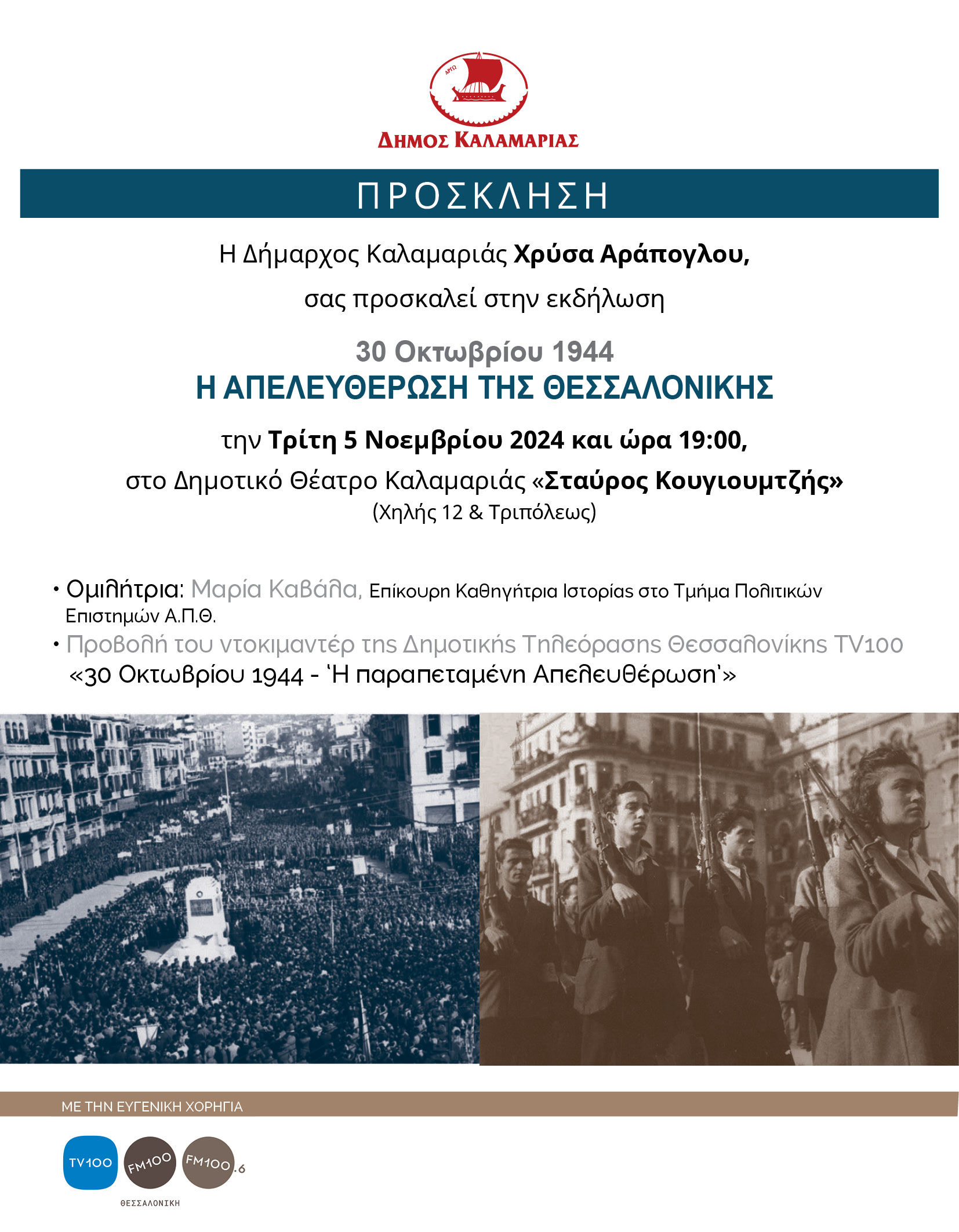 Με μία ξεχωριστή εκδήλωση όπου θα ζωντανέψουν οι μνήμες του Οκτώβρη του 1944 όταν οι δυνάμεις του ΕΛΑΣ μπήκαν στη Θεσσαλονίκη ως νικητές εκδιώκοντας τους κατακτητές ναζί, έχει προγραμματίσει ο Δήμος Καλαμαριάς. 80 χρόνια μετά τις 30 Οκτωβρίου 1944, ο Δήμος Καλαμαριάς καλεί την Τρίτη 5 Νοεμβρίου στις 7 μ.μ στο Δημοτικό Θέατρο «Σταύρος Κουγιουμτζής» σε μία ειδική εκδήλωση για την «ξεχασμένη», την «παραμελημένη» επέτειο, τη δεύτερη