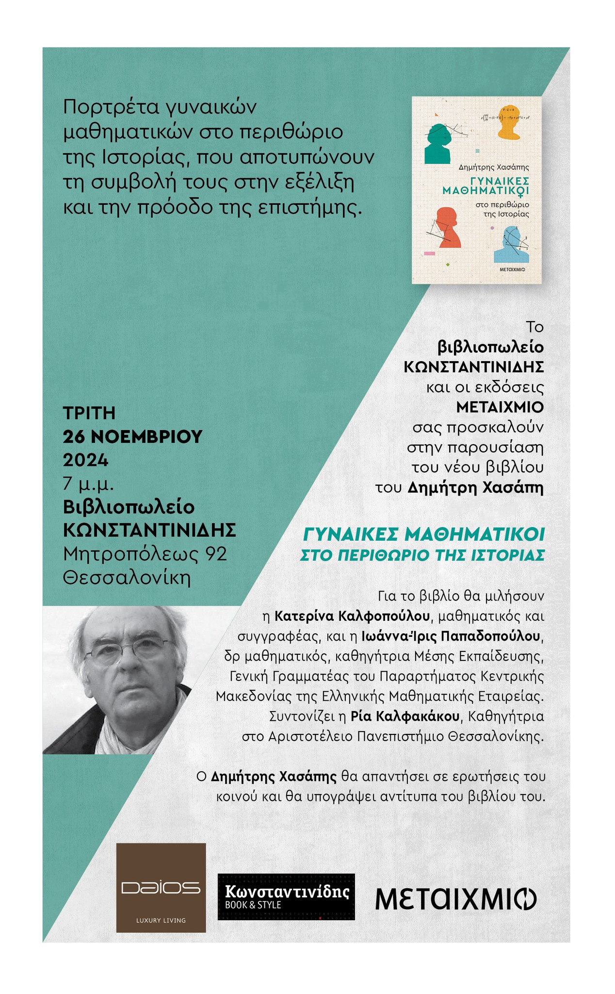 Το Βιβλιοπωλείο Κωνσταντινίδης και οι εκδόσεις Μεταίχμιο σας προσκαλούν στην παρουσίαση του βιβλίου του Δημήτρη Χασάπη, Γυναίκες Μαθηματικοί στο περιθώριο της ιστορίας.