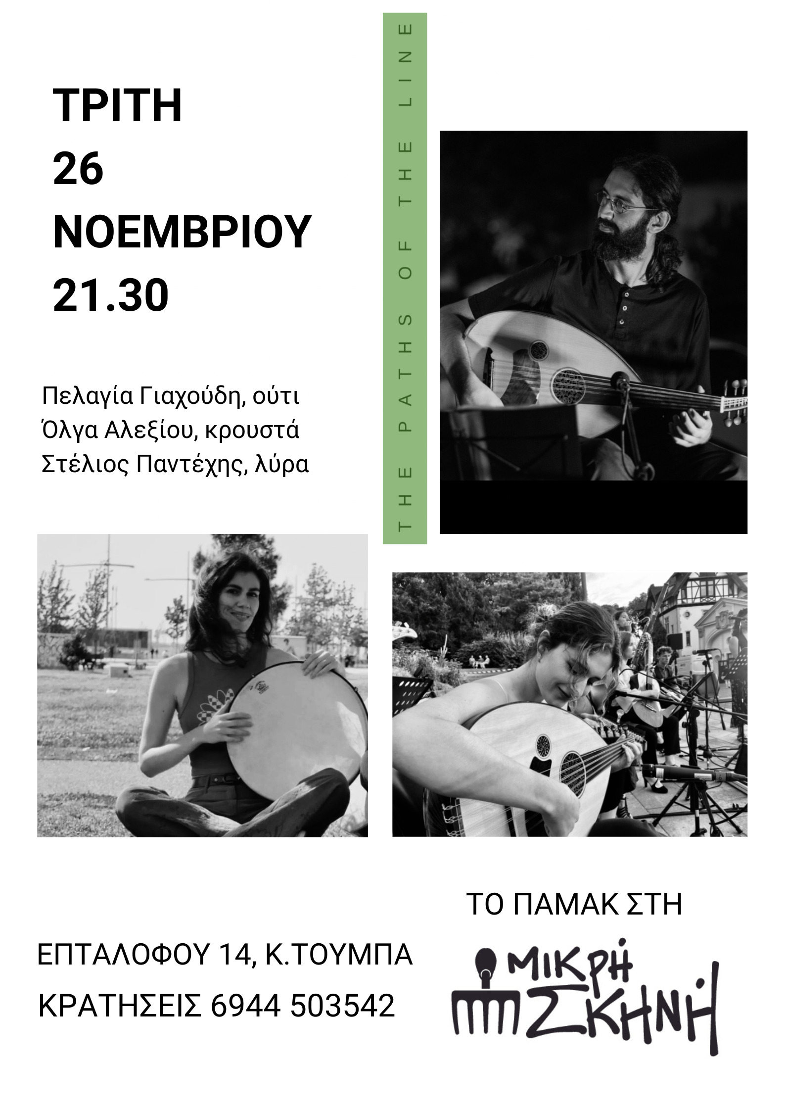 Το μουσικό project “The paths of the line” θα εμφανιστεί την Τρίτη 26 Νοεμβρίου στις 21.30. Το μουσικό project “The Paths of the Line” αποτελείται από τους Πελαγία Γιαχούδη (ούτι), Όλγα Αλεξίου (κρουστά) και Στέλιο Παντέχη (λύρα). Οι τρεις μουσικοί γνωρίστηκαν στο Πανεπιστήμιο και συνεργάστηκαν σε διάφορα projects και συναυλίες, τόσο από κοινού όσο και σε ατομικό επίπεδο. Με τις διαφορετικές εμπειρίες και τα ενδιαφέροντά τους, σε αυτό το project αναζητούν έναν κοινό ήχο, εξερευνώντας τα “μονοπάτια της γραμμής” όπως τα αντιλαμβάνονται. Εστιάζουν σε “σύγχρονες” τροπικές συνθέσεις από προηγούμενους δημιουργούς, αλλά και σε δικές τους πρωτότυπες συνθέσεις. Σκοπός τους είναι να υπηρετήσουν τη μονοφωνική μουσική, προσδίδοντας έναν ενιαίο χαρακτήρα που συνδέει τον κοινό τους ήχο και την αισθητική τους.