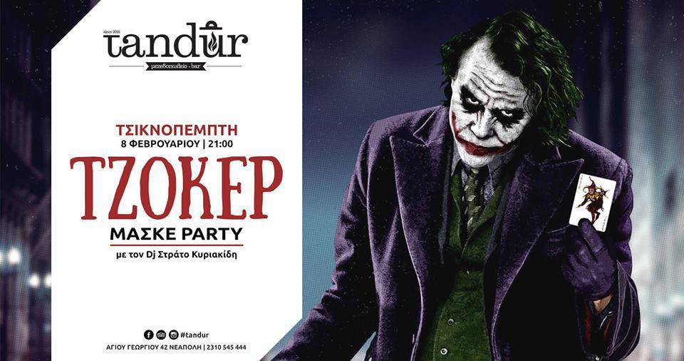 Ο Τζόκερ, ο πιο εκκεντρικός ήρωας όλων των εποχών, αυτή την Τσικνοπέμπτη σας καλεί με το ιδιαίτερο χαμόγελό του σε ένα Μασκέ Party που θα αγαπήσετε! Εσείς σαν άλλοι Τζόκερς στις 21.00 δίνετε το πιο διασκεδαστικό ραντεβού στο Tandur Μεζεδοπωλείο- Μπαρ!