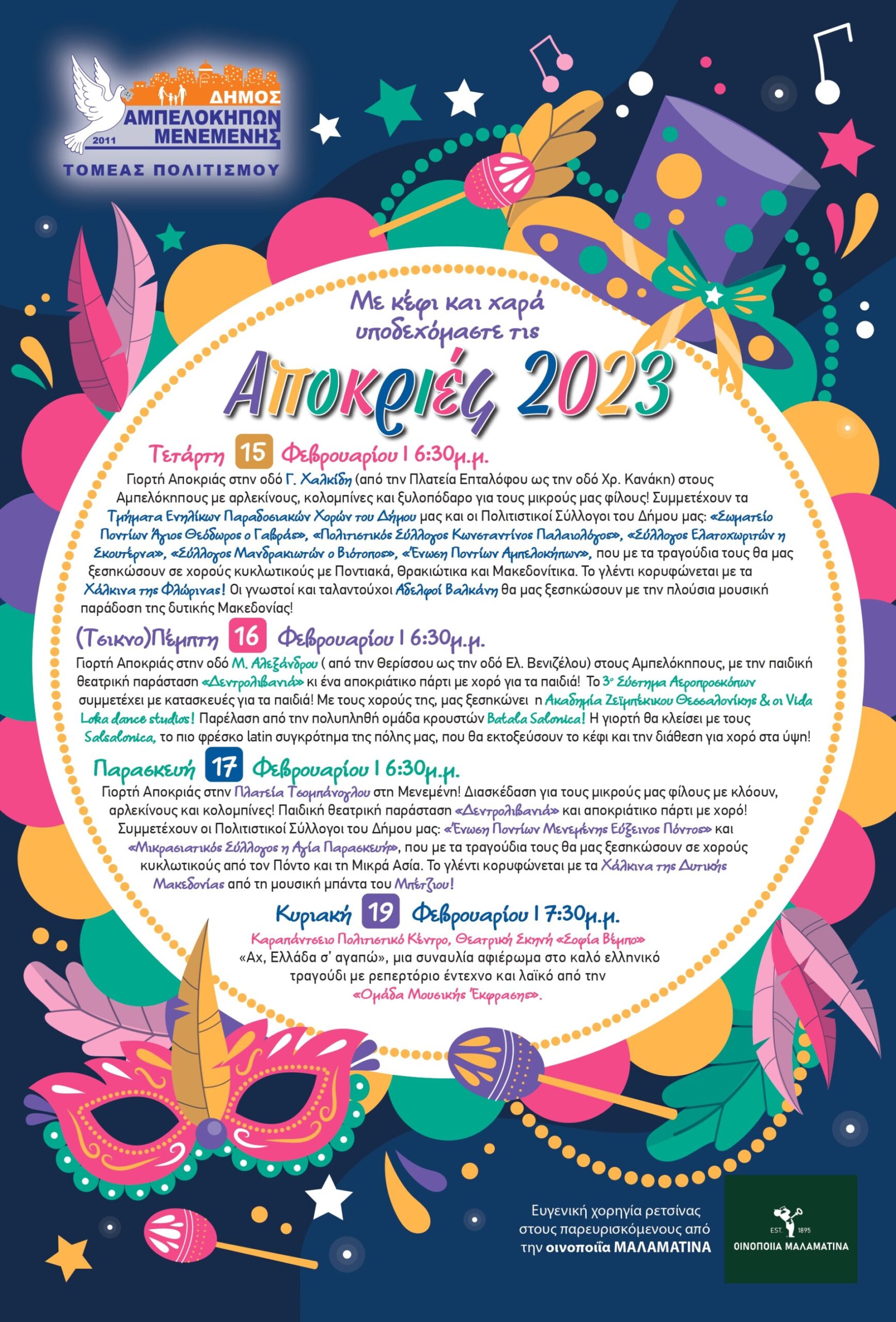 Γιορτή Αποκριάς στην οδό Γ. Χαλκίδη (από την Πλατεία Επταλόφου ως την οδό Χρ. Κανάκη) στους Αμπελόκηπους με αρλεκίνους, κολομπίνες και ξυλοπόδαρο για τους μικρούς μας φίλους! Συμμετέχουν τα Τμήματα Ενηλίκων Παραδοσιακών Χορών του Δήμου μας και οι Πολιτικοί Σύλλογοι του Δήμου μας : «Σωματείο Ποντίων Άγιος Θεόδωρος ο Γαβράς», «Πολιτιστικός Σύλλογος Κωνσταντίνος Παλαιολόγος», «Σύλλογος Ελατοχωριτών η Σκουτέρνα», «Σύλλογος Μανδρακιωτών ο Βιότοπος», «Ένωση Ποντίων Αμπελοκήπων», που με τα τραγούδια τους θα μας ξεσηκώσουν σε χορούς κυκλωτικούς με Ποντιακά, Θρακιώτικα και Μακεδονίτικα. Το γλέντι κορυφώνεται με τα Χάλκινα της Φλώρινας! Οι γνωστοί και ταλαντούχοι Αδελφοί Βαλκάνη θα μας ξεσηκώσουν με την πλούσια μουσική παράδοση της δυτικής Μακεδονίας!