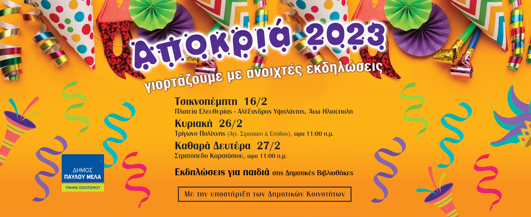 Ο Δήμαρχος Παύλου Μελά Δημήτριος Δεμουρτζίδης, ο Αντιδήμαρχος Πολιτισμού – Αθλητισμού Παντελής Νιγδέλης και το Τμήμα Πολιτισμού σας προσκαλούν στις εκδηλώσεις της Αποκριάς 2023 που θα γίνουν σε ανοιχτούς χώρους του Δήμου και στις Δημοτικές Δανειστικές Βιβλιοθήκες.
