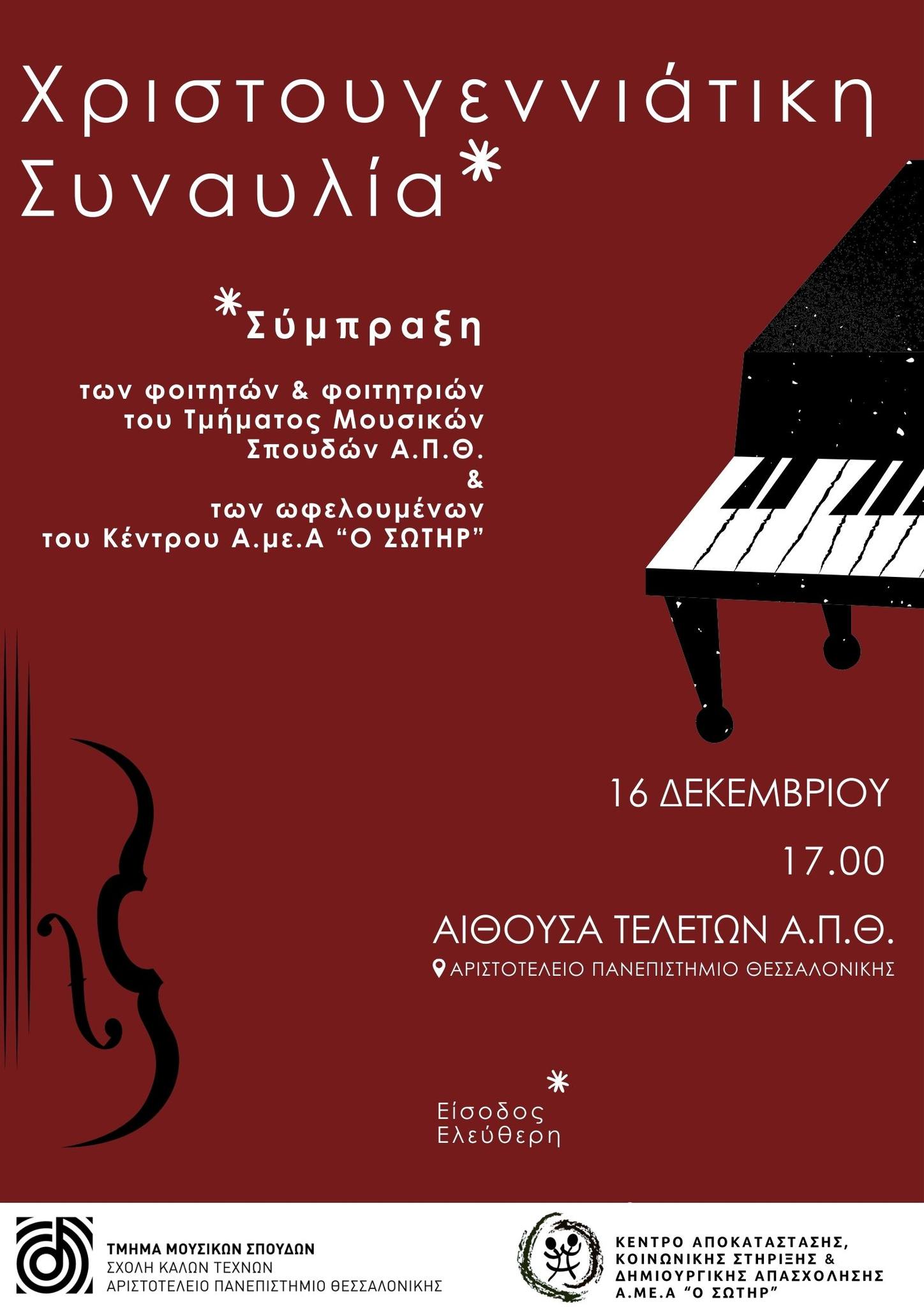 Τη Δευτέρα 16 Δεκεμβρίου, στην Αίθουσα Τελετών του Αριστοτελείου Πανεπιστημίου, θα πραγματοποιηθεί συναυλία – σύμπραξη των ωφελουμένων του Φορέα μας με τους φοιτητές και τις φοιτήτριες από το Τμήμα Μουσικών Σπουδών ΑΠΘ.
