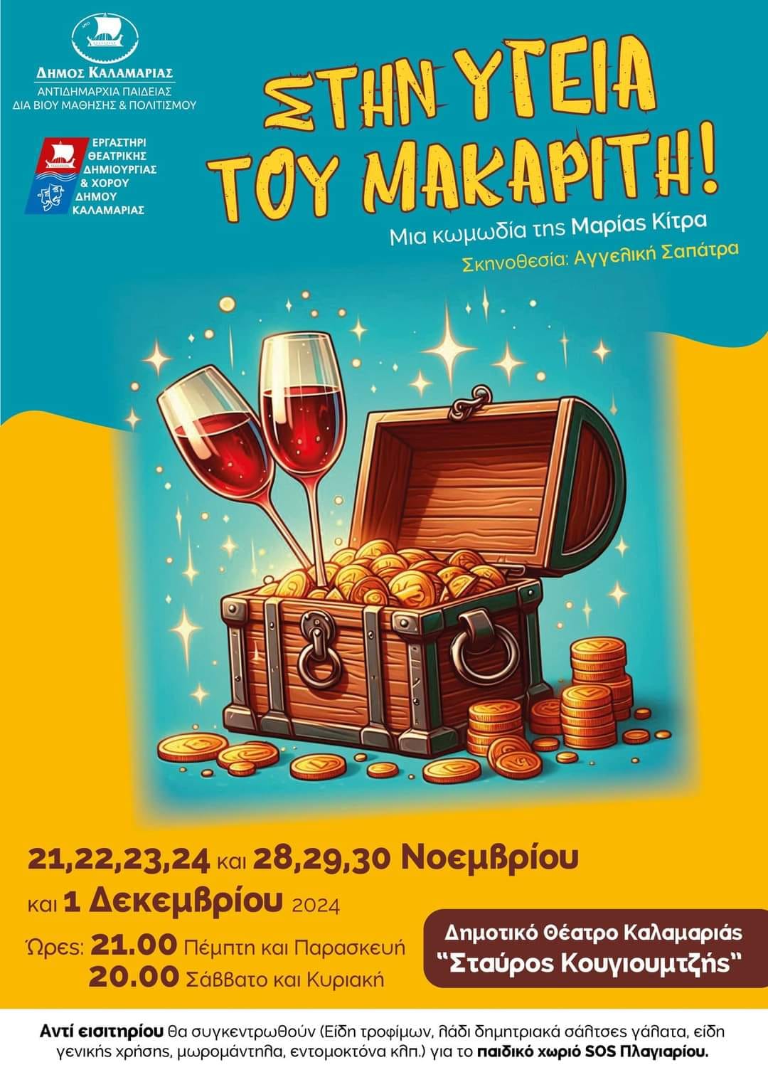 Το Εργαστήρι Θεατρικής Δημιουργίας και Χορού του Δήμου Καλαμαριάς υπόσχεται 8 μοναδικές παραστάσεις και γέλιο μέχρι δακρύων… στους θεατρόφιλους της Καλαμαριάς αλλά και ολόκληρης της Θεσσαλονίκης, που παρουσιάζει την κωμωδία «Στην υγειά του μακαρίτη» της Μαρίας Κίτρα σε σκηνοθεσία της Αγγελικής Σαπάτρα.