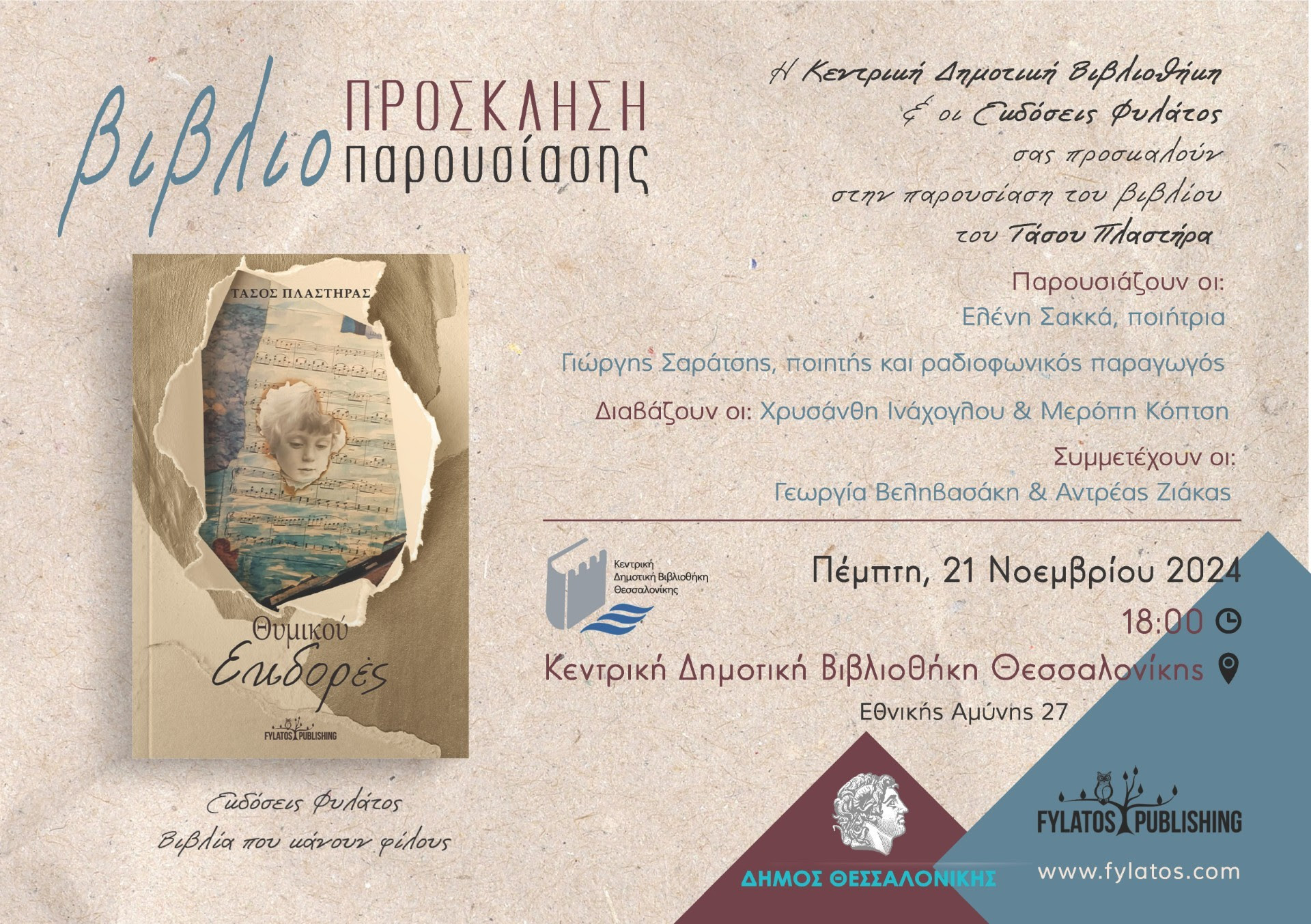 Η εκδήλωση θα πραγματοποιηθεί στην Κεντρική Δημοτική Βιβλιοθήκη Θεσσαλονίκης (Εθν. Αμύνης 27 & Αλ. Σβώλου) που θα γεμίσει από λόγια, συναισθήματα και τέχνη, την Πέμπτη, 21 Νοεμβρίου 2024 στις 18:00. Παρουσιάζουν οι: • Ελένη Σακκά, κριτικός και ποιήτρια • Γιώργης Σαράτσης, ποιητής και ραδιοφωνικός παραγωγός Διαβάζουν οι: • Χρυσάνθη Ινάχογλου • Μερόπη Κόπτση Συμμετέχουν οι: • Γεωργία Βεληβασάκη • Αντρέας Ζιάκας
