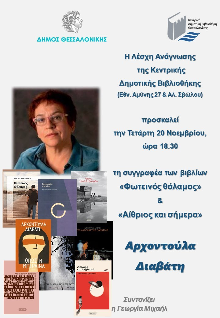 Η συνάντηση της Λέσχης Ανάγνωσης της Κεντρικής Βιβλιοθήκης στην οποία προσκεκλημένη είναι η πεζογράφος και ποιήτρια κα Αρχοντούλα Διαβάτη θα πραγματοποιηθεί στην αίθουσα εκδηλώσεων της Κεντρικής Δημοτικής Βιβλιοθήκης στις 18.30. Από τα βιβλία της κας. Διαβάτη, έχουν επιλεγεί προς συζήτηση μαζί της, τα “Φωτεινός θάλαμος” και το “Αίθριος και σήμερα”.