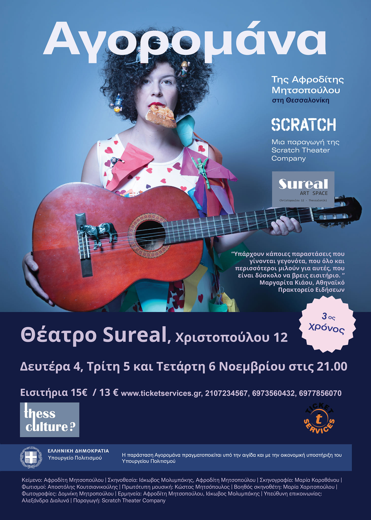Η παράσταση Αγορομάνα της Αφροδίτης Μητσοπούλου, που συνδυάζει stand-up comedy, ντοκιμαντέρ και μουσικό θέατρο, έρχεται στη Θεσσαλονίκη στο θέατρο Sureal Art Space, για περιορισμένο αριθμό παραστάσεων.