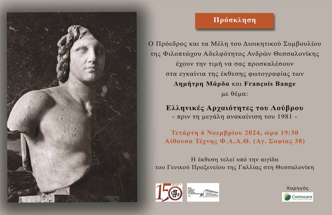 Η Φιλόπτωχος Αδελφότης Ανδρών Θεσσαλονίκης (Φ.Α.Α.Θ.), διοργανώνει Έκθεση Φωτογραφίας με θέμα «Ελληνικές αρχαιότητες του Λούβρου» που περιλαμβάνει 100 φωτογραφίες των Δημήτρη Μάρδα και François Bange πριν τη μεγάλη ανακαίνιση του μουσείου, το 1981.