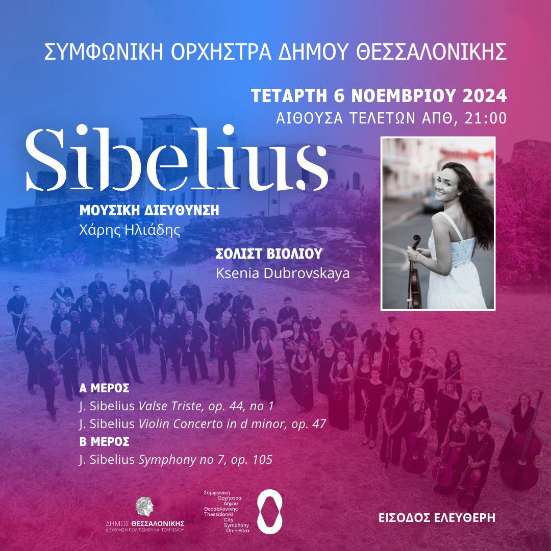 Μία μοναδική συναυλία με αριστουργηματικά έργα του κορυφαίου Φινλανδού συνθέτη Jean Sibelius (1865 – 1957), υπό τη μουσική διεύθυνση του Χάρη Ηλιάδη και με σολίστ τη διεθνώς αναγνωρισμένη και εξαιρετικά ταλαντούχα βιολονίστρια της νέας γενιάς, Ksenia Dubrovskaya, θα δώσει η Συμφωνική Ορχήστρα του Δήμου Θεσσαλονίκης.