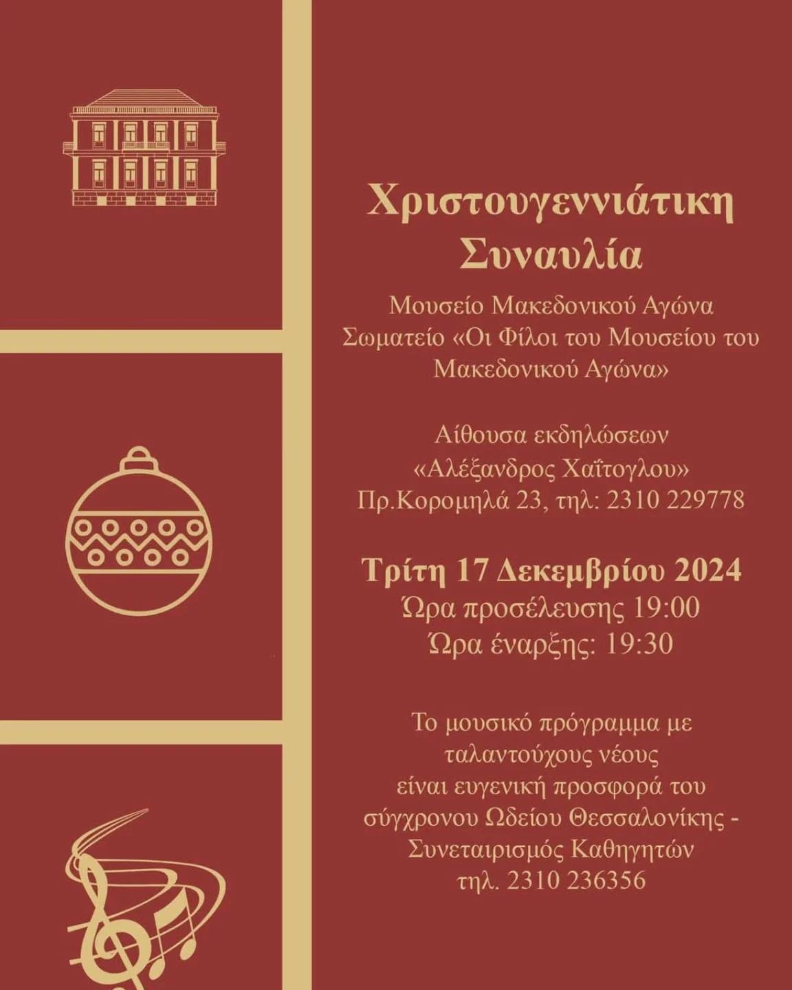 Το Σωματείο “Οι Φίλοι του Μουσείου του Μακεδονικού Αγώνα” διοργανώνουν την καθιερωμένη Χριστουγεννιάτικη Συναυλία στην Αίθουσα Εκδηλώσεων Αλέξανδρος Χαΐτογλου, στον χώρο του Μουσείου Μακεδονικού Αγώνα Θεσσαλονίκης.