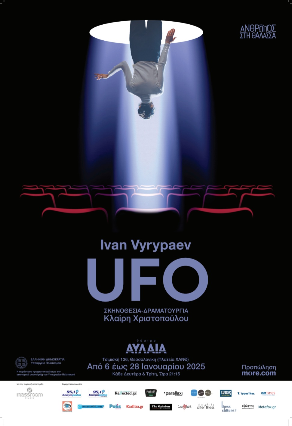 Σε πανελλήνια πρεμιέρα η Θεσσαλονίκη θα υποδεχθεί το θεατρικό έργο του Ivan Vyrypaev “UFO”, σε σκηνοθεσία Κλαίρης Χριστοπούλου, τον Ιανουάριο του 2025, στο θέατρο Αυλαία για για περιορισμένο αριθμό παραστάσεων.