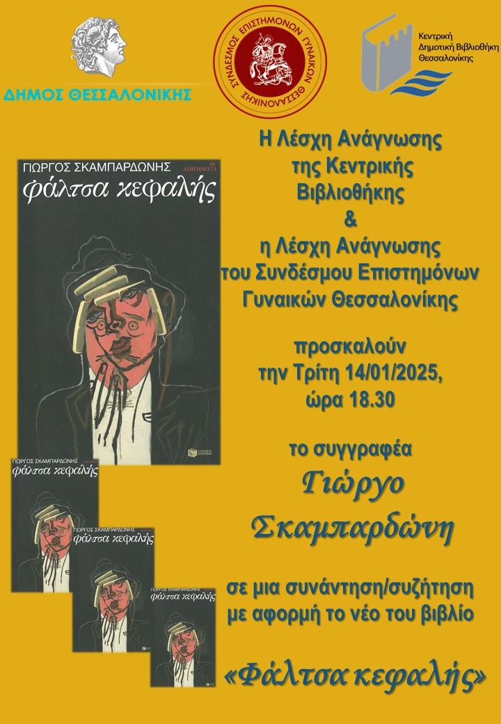Η Λέσχη Ανάγνωσης της Κεντρικής Βιβλιοθήκης συναντά τη Λέσχη Ανάγνωσης του Συνδέσμου Επιστημόνων Γυναικών Θεσσαλονίκης, στο πλαίσιο γνωριμίας της με τις Λέσχες Ανάγνωσης της πόλης. Προσκεκλημένος ο συγγραφέας Γιώργος Σκαμπαρδώνης σε μία συνάντηση – συζήτηση με αφορμή το νέο του βιβλίο «Φάλτσα Κεφαλής».