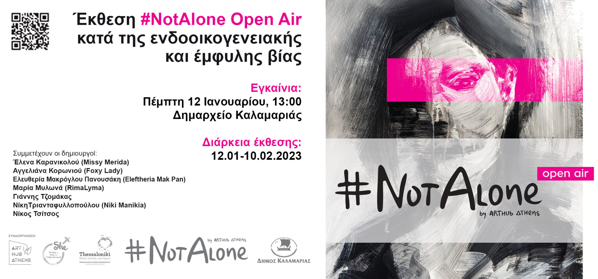 Η οργάνωση SHE-Society for Help & Empowerment μαζί με το φορέα ART HUB Athens σε συνεργασία με το Δήμο Καλαμαριάς και τον Οργανισμό Τουρισμού Θεσσαλονίκης παρουσιάζουν την ομαδική εικαστική έκθεση #NotAlone Open Air, με σκοπό να ευαισθητοποιήσουν το ευρύ κοινό, να συνδράμουν στην προσπάθεια κατά της έμφυλης βίας και να αναδείξουν την Τέχνη ως σημαντικό μέσο κοινωνικής αλλαγής.