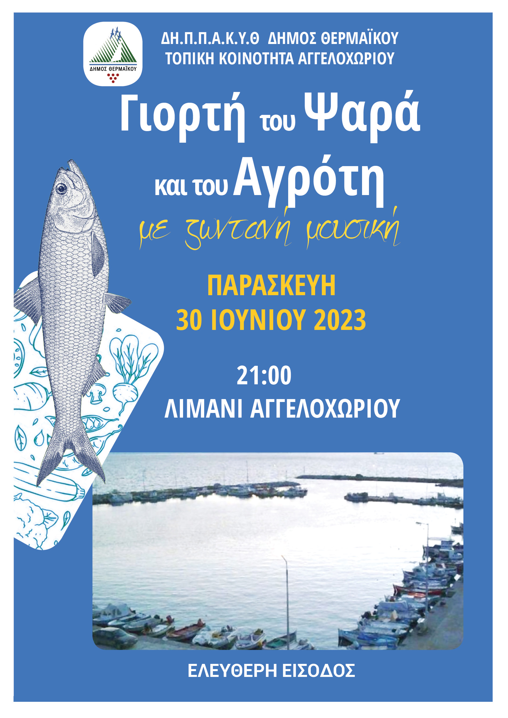 Τη Παρασκευή 30 Ιουνίου ο Δήμος Θερμαϊκού σε συνεργασία με την Τοπική Κοινότητα Αγγελοχωρίου σας προσκαλούν στη μεγάλη Γιορτή του Ψαρά στο λιμάνι του Αγγελοχωρίου.