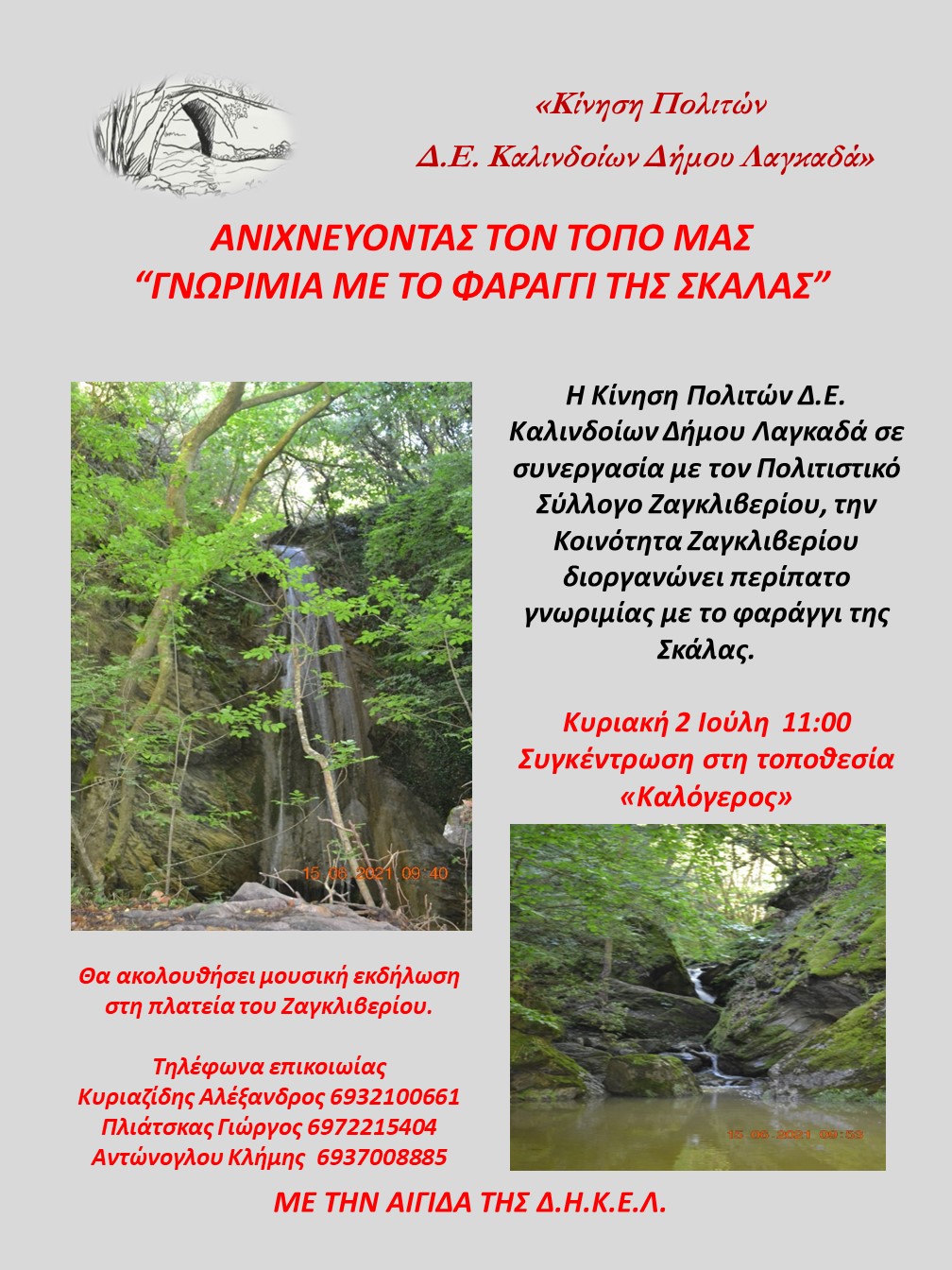 Την ευκαιρία να γνωρίσουν το Φαράγγι της Σκάλας με έναν ξεχωριστό τρόπο δίνουν σε επισκέπτες η Κίνηση Πολιτών Καλινδοίων, ο Πολιτιστικός Σύλλογος Ζαγκλιβερίου, η Κοινότητα Ζαγκλιβερίου σε συνεργασία με τη ΔΗΚΕ Δήμου Λαγκαδά και τον Δήμο Λαγκαδά.