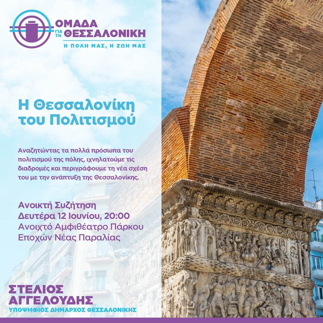 Η “Ομάδα για την Θεσσαλονίκη” και ο υποψήφιος δήμαρχος Στέλιος Αγγελούδης διοργανώνουν εκδήλωση – ανοιχτή συζήτηση την Δευτέρα 12 Ιουνίου στις 20.00 στο Ανοιχτό Αμφιθέατρο Πάρκου Εποχών Νέας Παραλίας (στο ύψος της Σχολής Τυφλών) με θέμα τη Θεσσαλονίκη του Πολιτισμού.
