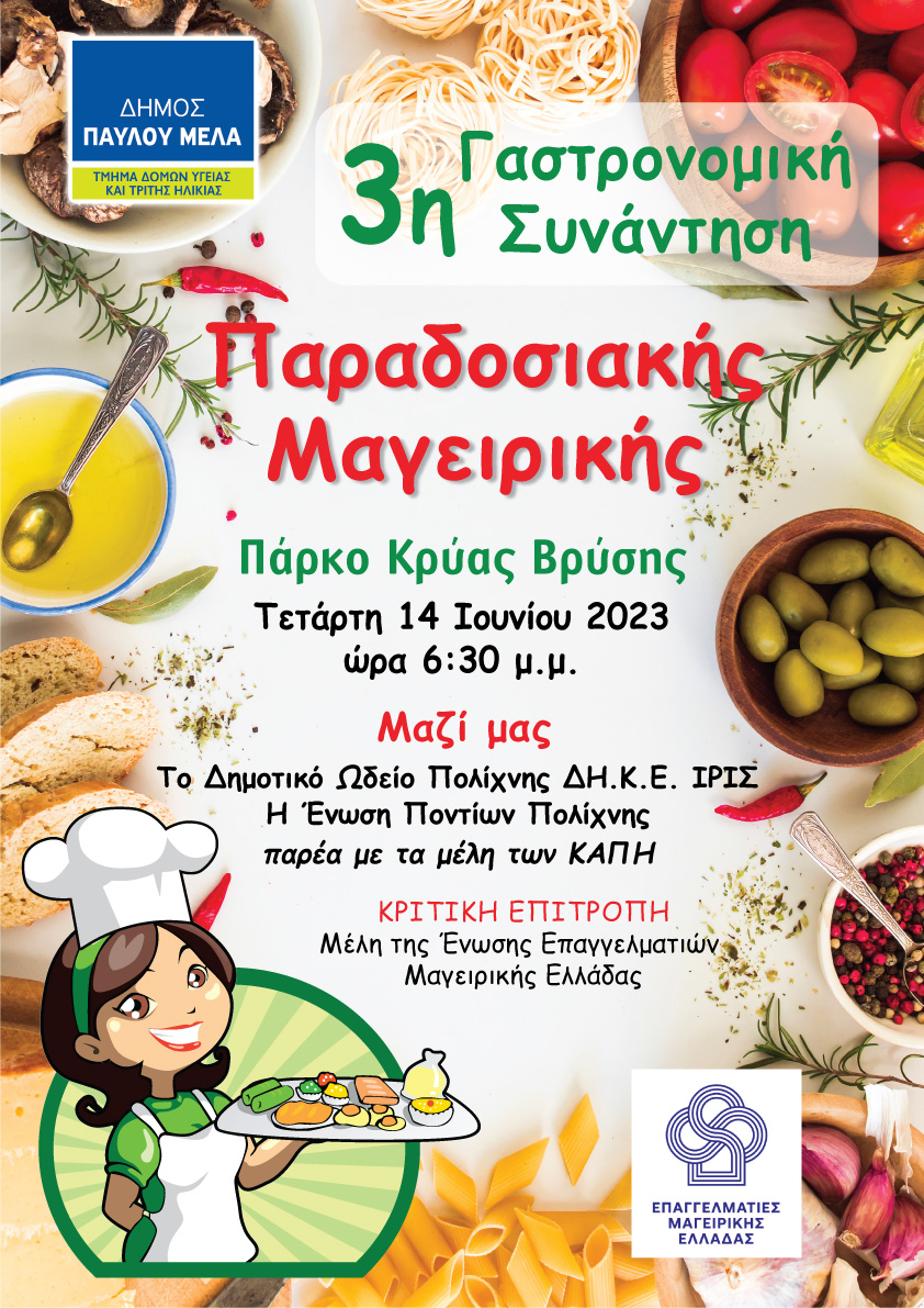 Η Γαστρονομική Συνάντηση Παραδοσιακής Μαγειρικής, ένας σπουδαίος θεσμός της Αντιδημαρχίας Κοινωνικής Πολιτικής και του Τμήματος Δομών Υγείας & Τρίτης Ηλικίας που ξεκίνησε στις 20 Μαΐου 2018 από την Πλατεία Αγίου Κωνσταντίνου Ευκαρπίας, συνεχίστηκε στις 10 Μαΐου 2019 στην Πλατεία Εδέσσης της Τερψιθέας Σταυρούπολης, διοργανώνεται για 3 η φορά στο Πάρκο Κρύας Βρύσης της Πολίχνης, την Τετάρτη 14 Ιουνίου 2023, στις 6:30 το απόγευμα.