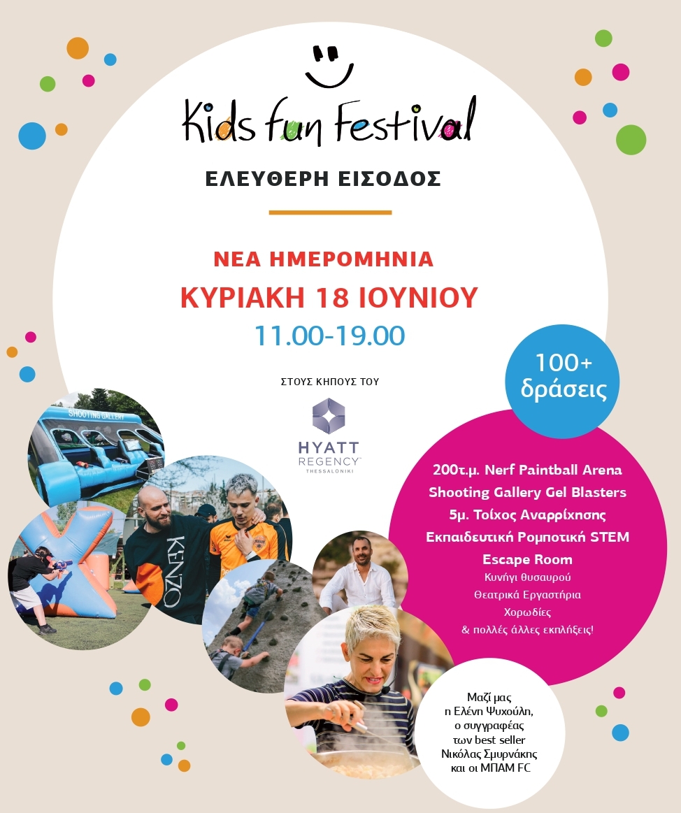 Λόγω έκτακτων καιρικών φαινομένων τo φεστιβάλ για το παιδί και την οικογένεια, το Kids Fun Festival, μεταφέρετε την Κυριακή 18 Ιουνίου. Το Kids Fun Festival, που πραγματοποιείται υπέρ των σκοπών του Ελληνικού Παιδικού Χωριού στο Φίλυρο, θα φιλοξενηθεί στους καταπράσινους κήπους του ξενοδοχείου Hyatt Regency Thessaloniki, από τις 11:00 μέχρι τις 19:00 και η είσοδος θα είναι ελεύθερη για όλους.