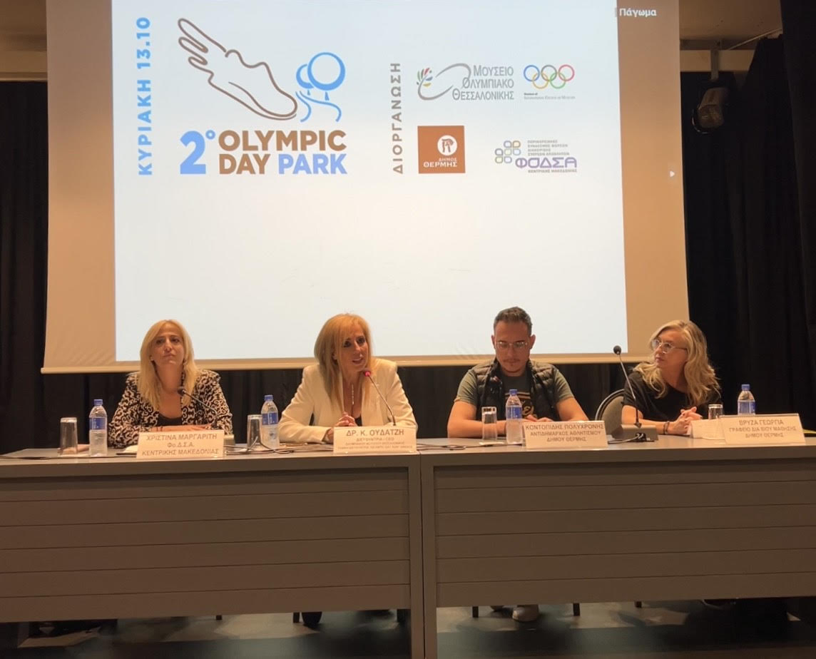 Την Τρίτη 8 Οκτωβρίου έλαβε χώρα στο αμφιθέατρο του Ολυμπιακού Μουσείου Θεσσαλονίκης, η συνέντευξη Τύπου για το 2ο “OlympicDayPark”, τον Ολυμπιακό θεσμό για όλη την οικογένεια, που από την 1η χρονιά υλοποίησής του αγκαλιάστηκε με θέρμη από μικρούς και μεγάλους. Το καινοτόμο φεστιβάλ αθλητικών, πολιτιστικών και περιβαλλοντικών δράσεων, θα υλοποιηθεί για 2η συνεχή χρονιά από το Ολυμπιακό Μουσείο Θεσσαλονίκης, τον Δήμο Θέρμης και τον Φορέα Διαχείρισης Στερεών Αποβλήτων Κεντρικής Μακεδονίας, στο Περιβαλλοντικό Πάρκο ΦΟ.Δ.Σ.Α., την Κυριακή 13 Οκτωβρίου.