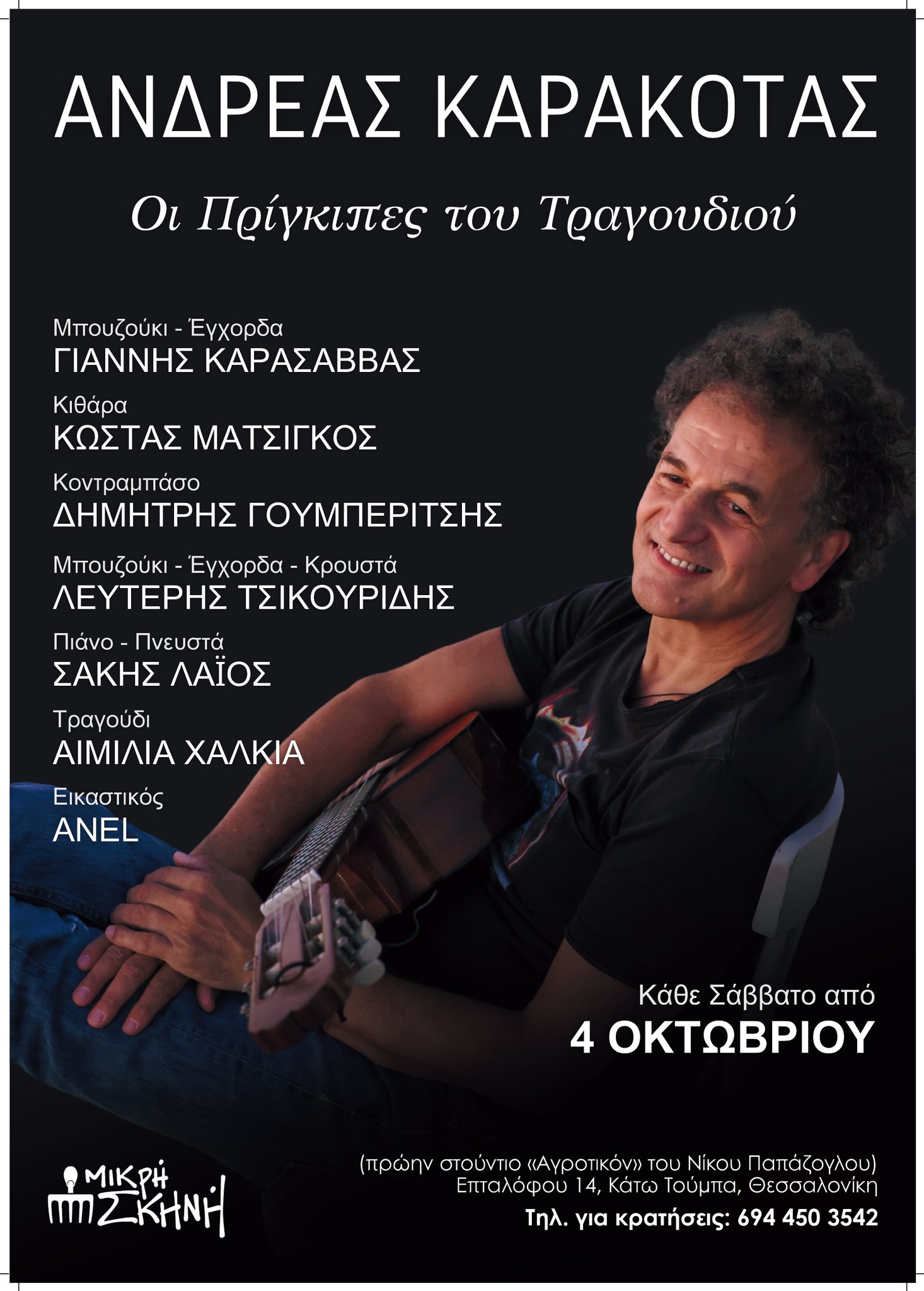 Ο Ανδρέας Καρακότας επιστρέφει στα γνωστά μουσικά του λημέρια και, από τη Μικρή Σκηνή στη Θεσσαλονίκη θα μας χαρίσει μουσικά βράδια, γεμάτα με «Πρίγκιπες του Τραγουδιού», όπως τιτλοφορείται και η νέα του δουλειά.