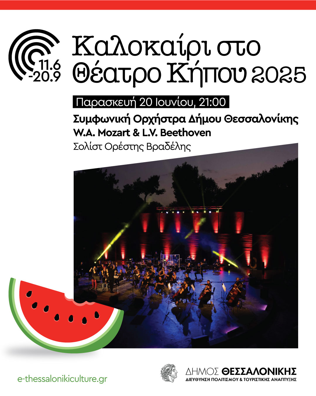 Στο πλαίσιο του Φεστιβάλ «Καλοκαίρι στο Θέατρο Κήπου 2025» η Συμφωνική Ορχήστρα του Δήμου Θεσσαλονίκης γιορτάζει την Ευρωπαϊκή Ημέρα Μουσικής με έργα δύο αντιπροσωπευτικών συνθετών της κλασικής μουσικής την Παρασκευή 20 Ιουνίου στο Θέατρο Κήπου.