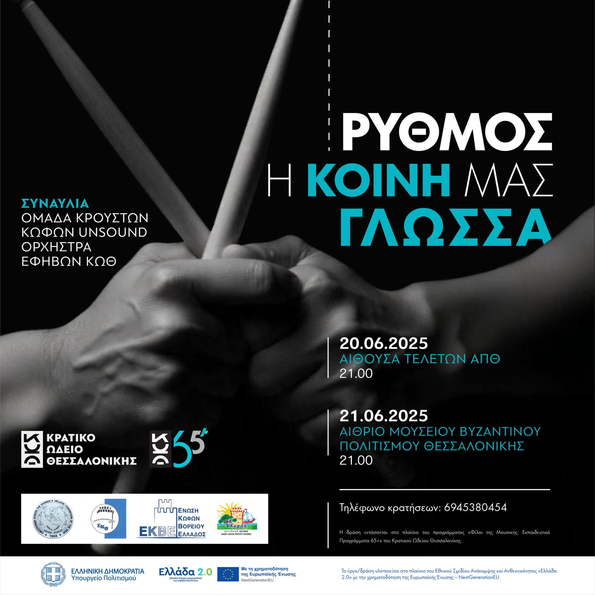 Το πρωτοποριακό μουσικό project «Ρυθμός – η Κοινή μας Γλώσσα» θα πραγματοποιηθεί στις 20 και 21 Ιουλίου στην Αίθουσα Τελετών του ΑΠΘ και στην αυλή του Βυζαντινού Μουσείου Θεσσαλονίκης, αντίστοιχα, με τη συμμετοχή της ομάδας Unsound –μιας ομάδας ατόμων με απώλεια ακοής που εκπαιδεύτηκαν σε κρουστά όργανα, κλασικά και σύγχρονα, σε διάστημα μικρότερο του ενός ακαδημαϊκού έτους.