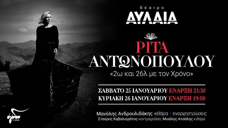 Το Ogdoo Music Group παρουσιάζει σε δύο μουσικές παραστάσεις το Σάββατο 25 Ιανουαρίου και Κυριακή 26 Ιανουαρίου στο Θέατρο Αυλαία στη Θεσσαλονίκη τη νέα παράσταση της Ρίτας Αντωνοπούλου.Το νέο καλλιτεχνικό εγχείρημα είναι βασισμένο στο αιώνιο και θεμελιώδες για την ανθρωπότητα ζήτημα του ΧΡΟΝΟΥ που έχει απασχολήσει τους δημιουργούς από την πρώτη στιγμή που ανέτειλε στον κόσμο η καλλιτεχνική έκφραση. Αυτή τη φορά η ιδέα της αγαπημένης ερμηνεύτριας ζωντανεύει επί σκηνής με τη συμμετοχή τριών ταλαντούχων μουσικών, συνδυάζοντας τη φυσική θεατρικότητα της ερμηνείας της, με επιλογές τραγουδιών που κινούνται αρμονικά σαν δορυφόροι γύρω από τον πυρήνα του κεντρικού θέματος.