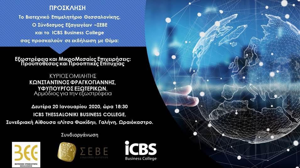 Το Βιοτεχνικό Επιμελητήριο Θεσσαλονίκης, ο Σύνδεσμος Εξαγωγέων Βορείου Ελλάδος – ΣΕΒΕ και το ICBS Business College διοργανώνουν τη Δευτέρα 20 Ιανουαρίου 2020 και ώρα 18:30, στη συνεδριακή αίθουσα «Λίτσα Φωκίδη» του ICBS Thessaloniki Business College, Γαλήνη Ωραιοκάστρου, εκδήλωση με Θέμα: Εξωστρέφεια και Μικρομεσαίες Επιχειρήσεις: Προϋποθέσεις και Προοπτικές Επιτυχίας. Κύριος ομιλητής της εκδήλωσης θα είναι ο κύριος Κωνσταντίνος Φραγκογιάννης, Υφυπουργός Εξωτερικών, Αρμόδιος για την εξωστρέφεια.