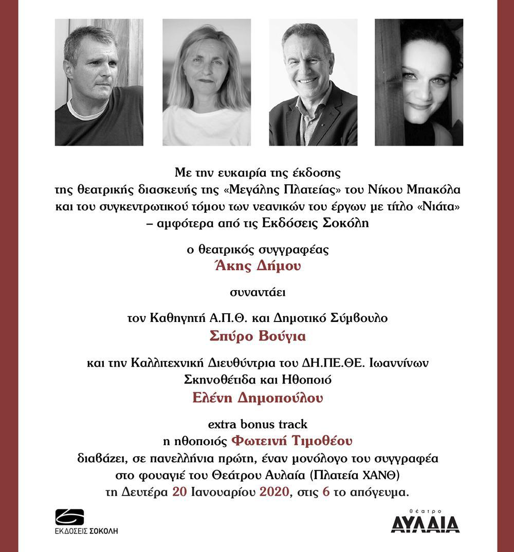 Μια «μεγάλη συνάντηση» θα σημειωθεί στο Θέατρο Αυλαία την Δευτέρα 20 Ιανουαρίου, καθώς τέσσερα κορυφαία πρόσωπα θα βρεθούν, θα συνομιλήσουν και θα εξερευνήσουν νοητικά με αφορμή δύο ενδιαφέρουσες εκδόσεις. Κι αυτό καθώς με την ευκαιρία της έκδοσης της θεατρικής διασκευής της «Μεγάλης Πλατείας» του Νίκου Μπακόλα και του συγκεντρωτικού τόμου των νεανικών του έργων με τίτλο «Νιάτα» –αμφότερα από τις Εκδόσεις Σοκόλη– ο θεατρικός συγγραφέας Άκης Δήμου συναντάει τον καθηγητή Α.Π.Θ. και δημοτικό σύμβουλο Σπύρο Βούγια και την καλλιτεχνική διευθύντρια του ΔΗ.ΠΕ.ΘΕ. Ιωαννίνων, σκηνοθέτιδα και ηθοποιό Ελένη Δημοπούλου και μιλούν για το συγγραφικό έργο, την ελληνική δραματουργία και τη θεατρική πραγματικότητα. Στο τέλος της βραδιάς, η ηθοποιός Φωτεινή Τιμοθέου διαβάζει, σε πανελλήνια πρώτη, έναν μονόλογο του συγγραφέα στο φουαγιέ του Θεάτρου Αυλαία (Πλατεία ΧΑΝΘ)