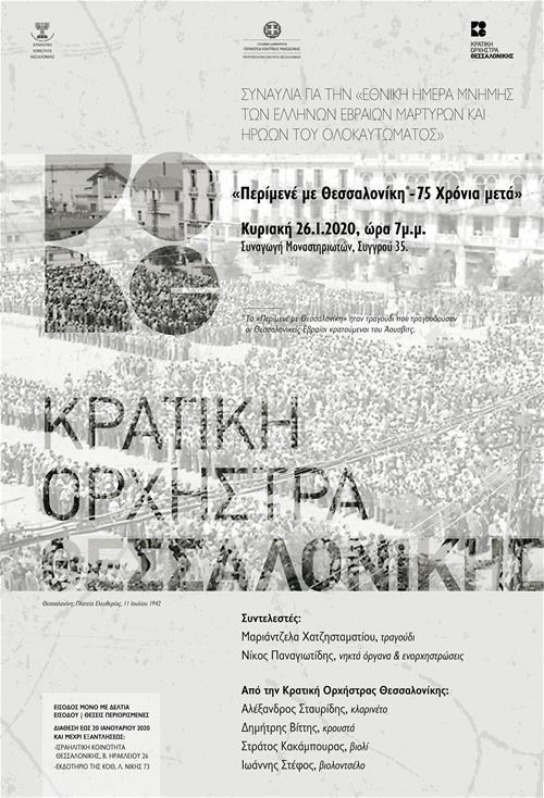 Η Ισραηλιτική Κοινότητα Θεσσαλονίκης, σε συνεργασία με την Κρατική Ορχήστρα Θεσσαλονίκης και την υψίφωνο Μαριάντζελα Χατζησταματίου, τιμώντας την Ημέρα Μνήμης των Ελλήνων Εβραίων Μαρτύρων και Ηρώων του Ολοκαυτώματος και την 75η επέτειο από την απελευθέρωση των στρατοπέδων εξόντωσης Άουσβιτς-Μπίρκεναου, διοργανώνει την Κυριακή 26 Ιανουαρίου 2020 και ώρα 19:00, στη Συναγωγή Μοναστηριωτών (Συγγρού 35) τη συναυλία «Περίμενέ με Θεσσαλονίκη – 75 Χρόνια Μετά».