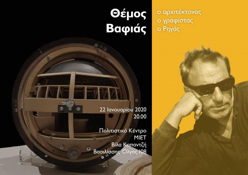 Θέλοντας να ευχαριστήσει την οικογένεια του Θέμου Βαφιά για την παραχώρηση του αρχείου του στο ΕΛΙΑ, το Μορφωτικό Ίδρυμα Εθνικής Τραπέζης οργανώνει βραδιά αφιερωμένη στον αρχιτέκτονα και γραφίστα που έφυγε από τη ζωή πριν από ένα χρόνο. Οι ομιλητές θα αναφερθούν στην επαγγελματική πορεία του Βαφιά, στον άνθρωπο Θέμο και στο αρχείο του, ένα αντικείμενο του οποίου –η μακέτα για το Περίπτερο Περιβαλλοντικής Ενημέρωσης Geo Eco– παρουσιάζεται στην τρέχουσα έκθεση στη Βίλα Καπαντζή. Στις 19.00, πριν από τις ομιλίες, θα προηγηθεί σύντομη ξενάγηση στην έκθεση. Η εκδήλωση είναι ανοικτή στο κοινό και δεν απαιτείται κράτηση θέσης.