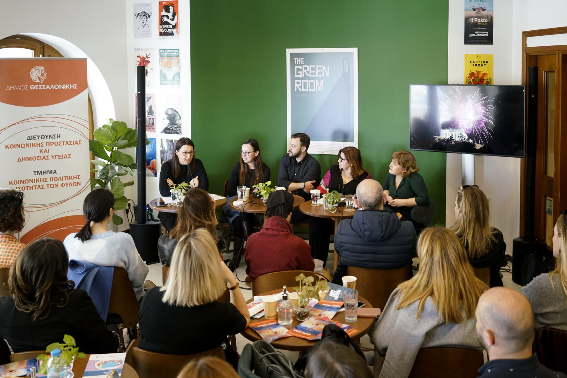 Η ανοιχτή συζήτηση «Έμφυλη Βία: Βλέπω, Ακούω, Μιλάω» πραγματοποιήθηκε την Πέμπτη 9 Μαρτίου, στο Πράσινο Δωμάτιο, στο Ολύμπιον. Στη διάρκεια της συζήτησης εξερευνήθηκαν οι μορφές της έμφυλης βίας, του καθημερινού, παγκόσμιου φαινομένου που πλήττει στη συντριπτική πλειοψηφία γυναίκες, νεαρά κορίτσια και ΛΟΑΤΚΙ+ άτομα, ενώ αναφέρθηκαν οι τρόποι για να γίνουν ορατές οι αόρατες εκφάνσεις του. Στη συζήτηση συμμετείχαν οι: Ευθυμία Ζυμβραγάκη, σκηνοθέτιδα του ντοκιμαντέρ Τώρα το φως πέφτει κάθετα, Ανδρέας Βάγιας, δημοσιογράφος και δημιουργός του podcast Mute – Η σιωπηλή βία της μεσοτοιχίας, Ιωάννα Κοσμοπούλου, Αντιδήμαρχος Κοινωνικής Πολιτικής και Πρόεδρος της Δημοτικής Επιτροπής Ισότητας Δήμου Θεσσαλονίκης, Εύα Γκάση, υπεύθυνη Διαχείρισης Περιστατικών Έμφυλης Βίας του Κέντρου Διοτίμα στη Θεσσαλονίκη, καθώς και το επιστημονικό προσωπικό του Ξενώνα Φιλοξενίας Γυναικών θυμάτων βίας Δήμου Θεσσαλονίκης. Τη συζήτηση συντόνισε η Δήμητρα Νικολοπούλου, δημοσιογράφος και επικεφαλής Επικοινωνίας του Φεστιβάλ Κινηματογράφου Θεσσαλονίκης.