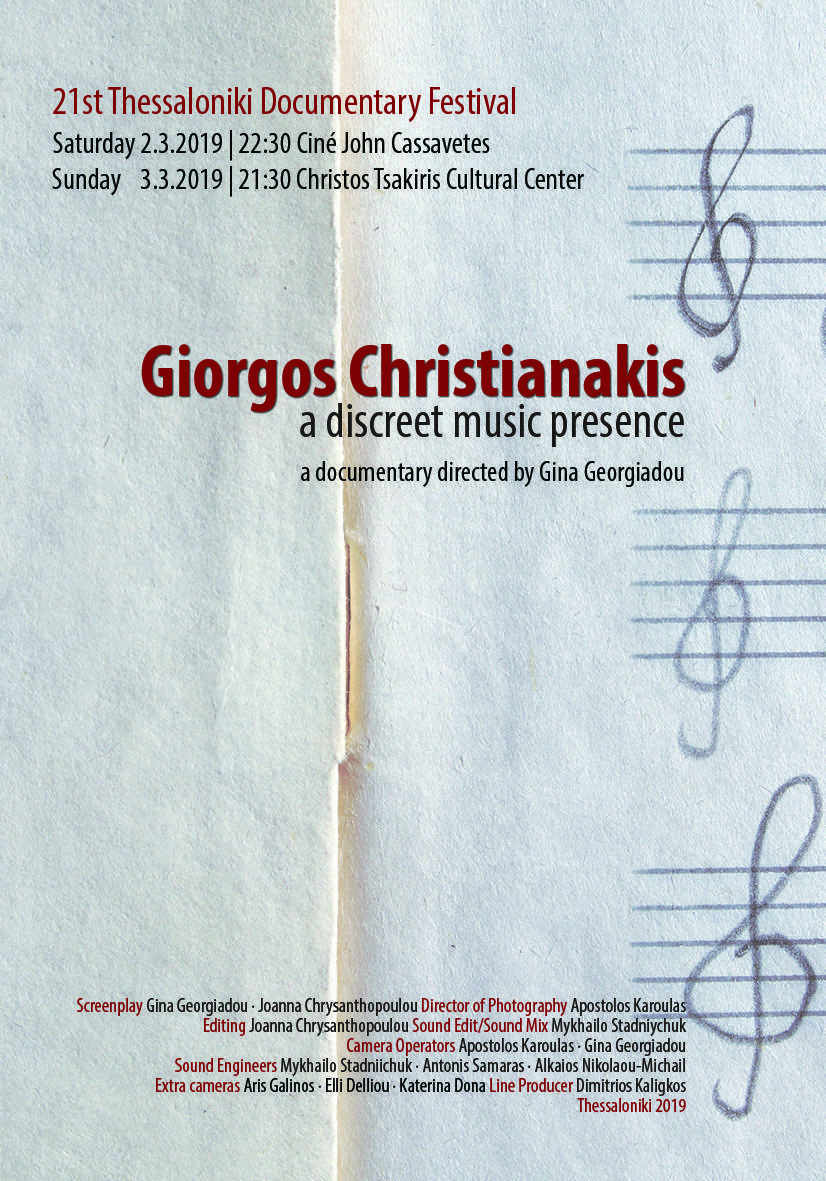 *Γιώργος Χριστιανάκης – Μια διακριτική μουσική παρουσία, Σάββατο 2 Μαρτίου, αίθουσα Τζον Κασσαβέτης, στις 22.30 & Κυριακή 3 Μαρτίου, αίθουσα Χρήστος Τσακίρης στη Σταυρούπολη, στις 21.30 | Facebook Page του ντοκιμαντέρ ΕΔΩ | Η φιλμογραφία της Τζίνας Γεωργιάδου: 2016 Beatbox και αερόφωνα – Νίκος Δημηνάκης, 2016 Η Ιουλίτα Ηλιοπούλου και ο Γιώργος Κουρουπός συναντούν την Πράσινη Σκουφίτσα (μμ), 2017 Θεσσαλονίκη 2017 – Ένας αιώνας από τη μεγάλη πυρκαγιά (μμ), 2018 Ο θείος μου ο Αρχιμήδης (μμ), 2018 Αμαλία Ζογλοπίτου – Προσεγγίζοντας την ψυχή (μμ)