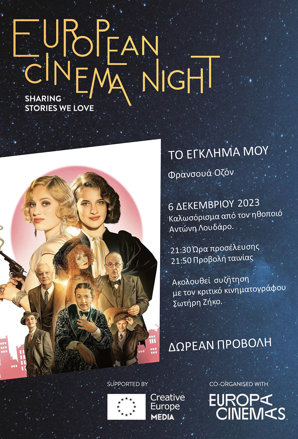 Στο πλαίσιο της Ευρωπαϊκής Νύχτας Κινηματογράφου 2023, στη Θεσσαλονίκη στον κινηματογράφο ΚΟΛΟΣΣΑΙΟΝ (μέλος των Europa Cinemas), θα πραγματοποιηθεί την Τετάρτη 6 Δεκεμβρίου στις 9:50μ.μ. ΔΩΡΕΑΝ ΠΡΟΒΟΛΗ της ταινίας «ΤΟ ΕΓΚΛΗΜΑ ΜΟΥ» του Φρανσουά Οζόν